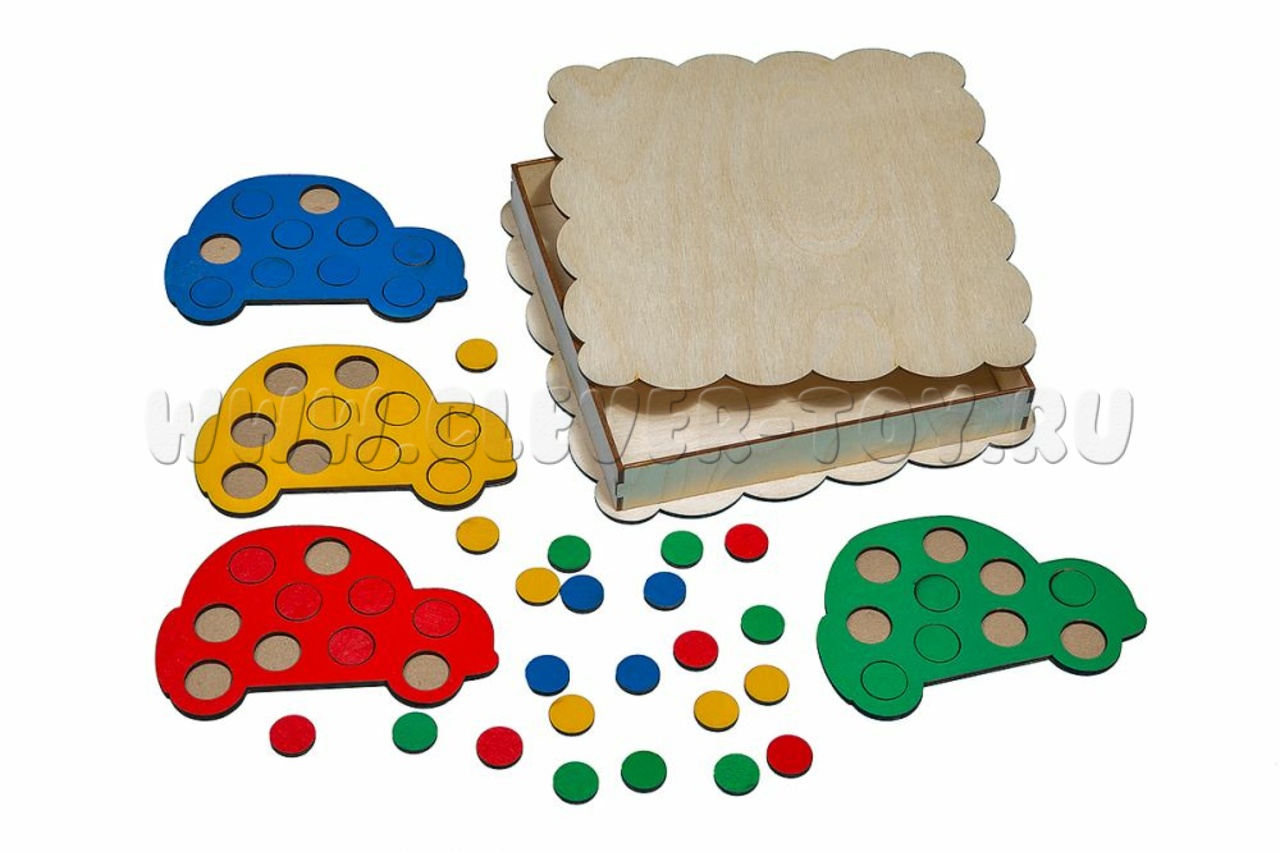 1. Сортируйте кружочки по цветам и вкладывайте в машинки соответствующег цвета;