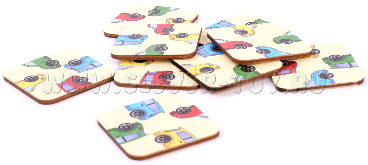 2. Игра "Автослесарь". Достаньте несколько элементов головоломки из рамки-основания. Предложите ребенку вставить квадраты обратно в рамку так, чтобы половинки машинок (капот и багажник) соответствовали друг другу по цвету.  Если ребенок легко справляется с заданием, то извлеките все элементы и попросите собрать машинки в автомастерской.