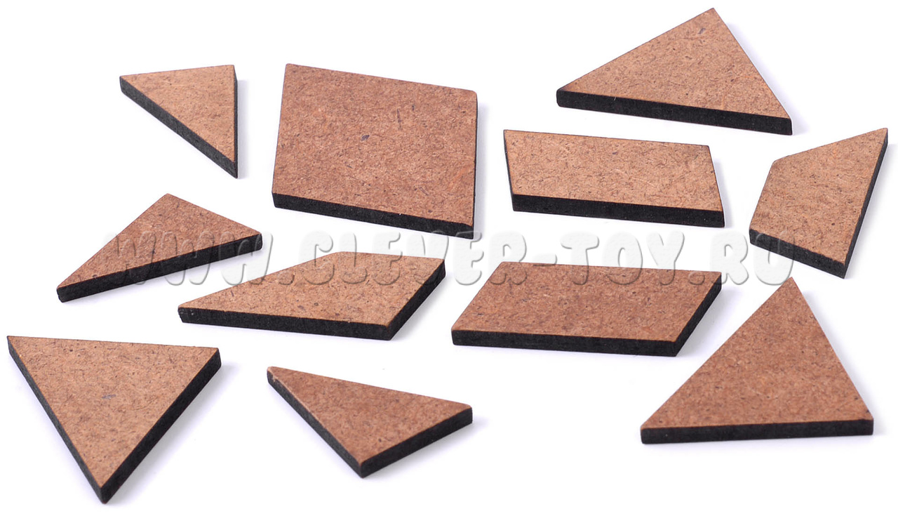 Задачи: соберите фигуры по приведенным силуэтам. Для составления каждой фигуры необходимо использовать все 11 элементов, их можно как угодно перемещать, поворачивать, переворачивать, но нельзя накладывать друг на друга.