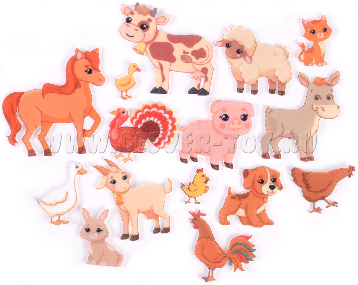 • 16 фигурок животных из фетра - коровы, куры, лошади, гуси, овцы, свиньи, коты, собаки, птички, мышки (мамы, папы и детёныши),