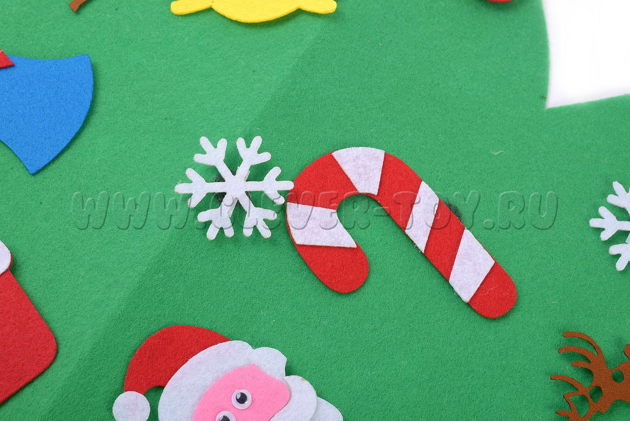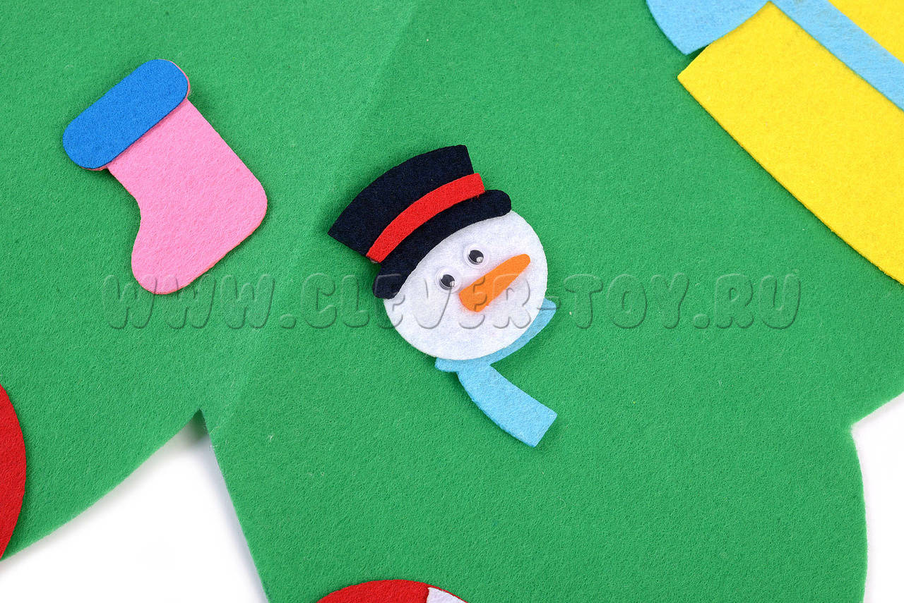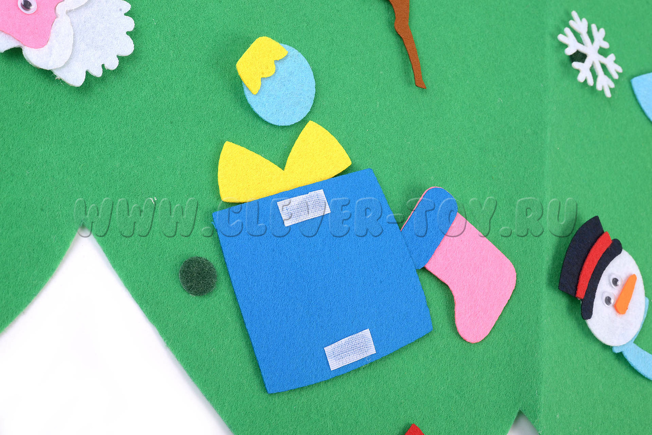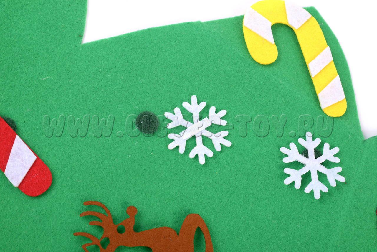 Елка изготовлена из фетра и ковролина. Сочетание этих материалов делает игрушку плотной, долговечной, но при этом приятной на ощупь и безопасной для детей.