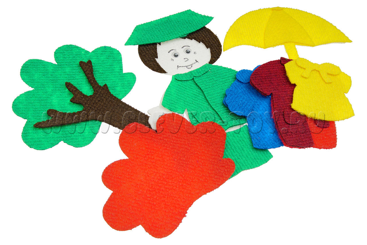 - одежда, аксессуары и атрибуты весны (зелёный): шапка, пальто, сапоги, корзинка, зонт, дерево, трава, лягушонок, цветок;