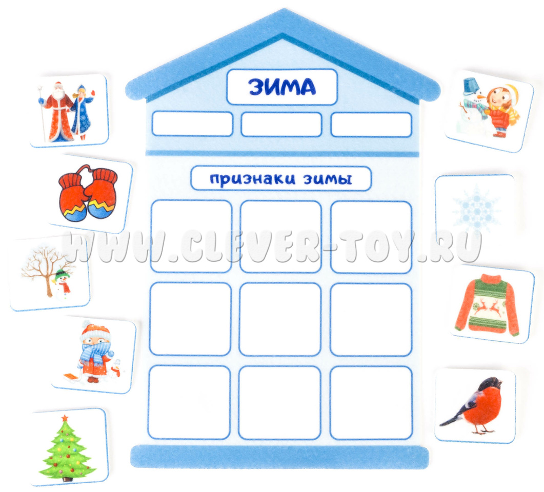 • маленькие фигурки на липучках с изоброжением деревьев, мальчиков, девочек, птиц, ягод, солнца, снежинки и т.д..