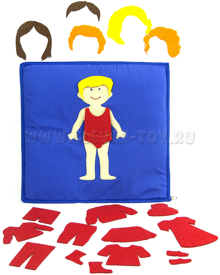 • одежда и обувь (синий, красный, желтый, зеленый) - куртка, теплые штаны, шапочка, пуловер, футболка, шорты, брюки, юбка, платье, трусики с маечкой, туфли, сапоги;