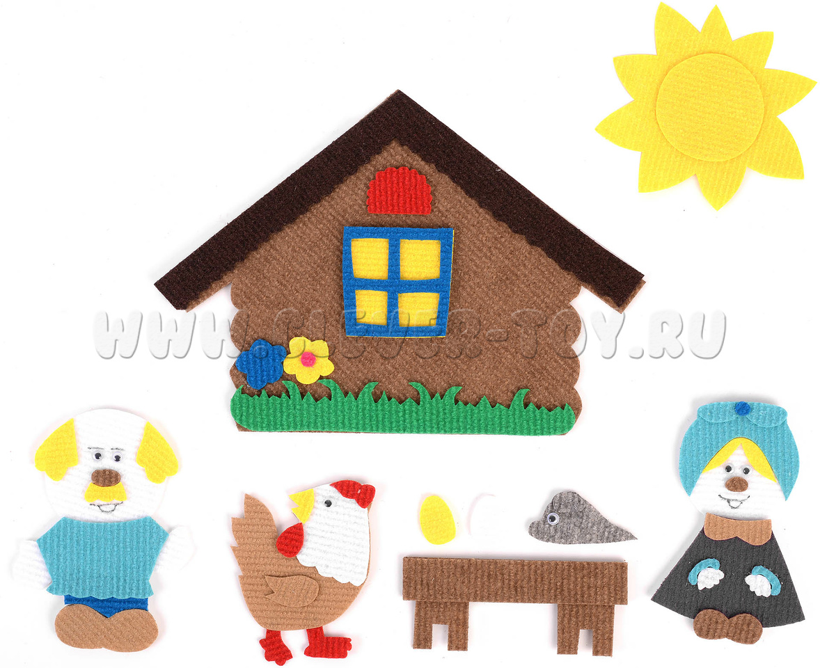 • персонажи – дед, бабка, внучка, жучка, кошка, мышка маленькая, колобок, кот, курочка Ряба, журавль, мышка-норушка, лягушка, ёжик, петушок, зайка белый, зайка серый, волк, лиса, медведь, соломенный бычок, 2 собаки, 2 охотника, матушка, медведица, медвежонок, коза, 7 козлят, 3 поросёнка;