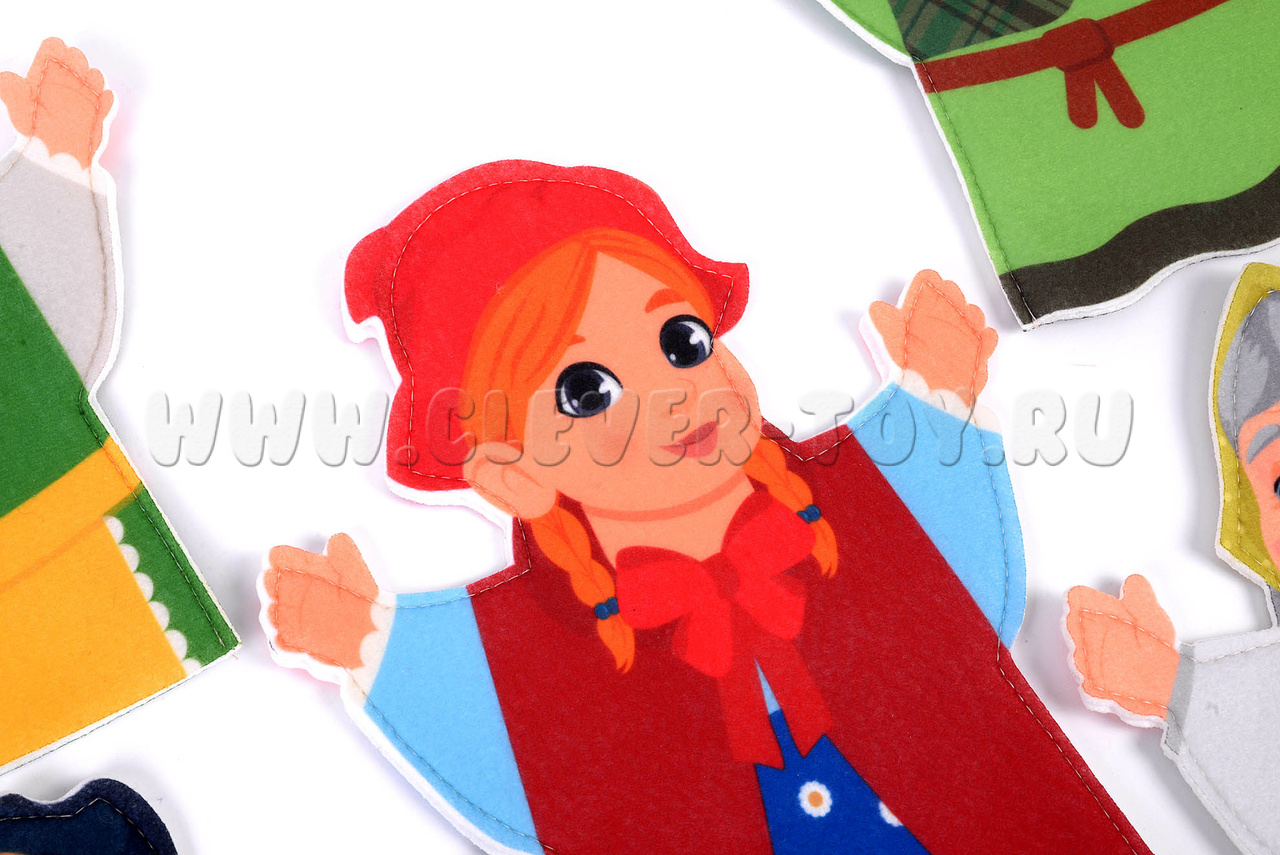 В составе набора 5 фигурок: Красная шапочка, волк, мама, бабушка, охотник. Средний размер фигурок 195*235 мм.