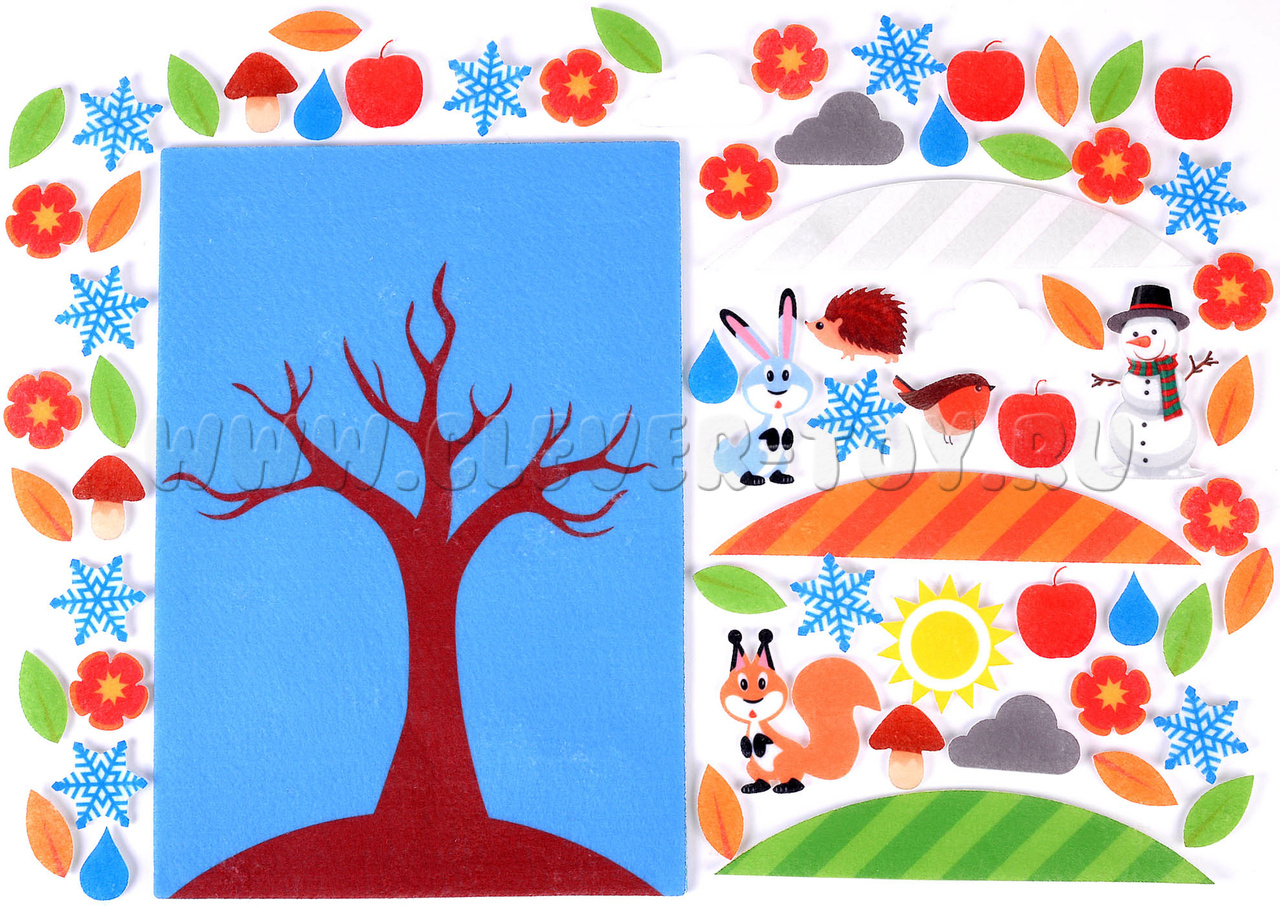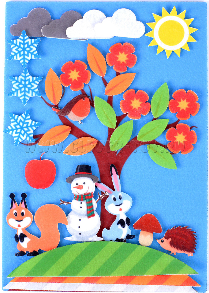 • разнообразные игровые элементы 4-х сезонов – зелёные и оранжевые листики, цветочки, яблочки, снежинки, облака, тучки, холмики, грибочки, дождевые капельки, солнце, ёжик, снеговик, белочка, зайчик, снегирь;