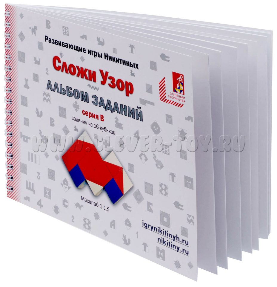С помощью альбома серии В и кубиков «Сложи узор» ребёнок сможет сложить шахматную доску, домик, песочные часы, дедушку, ракету, звёздочку, маяк, крабика, медаль, красный крест, крюк, автомобиль и более 10-ти геометрических узоров.