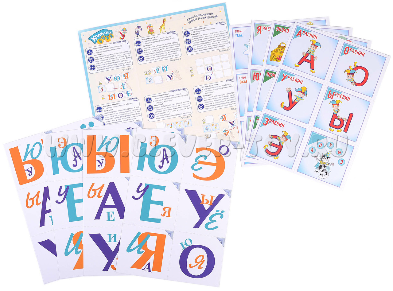 Цель всех игр – поиск букв с заданными отличительными признаками. Дополнительные опции в виде призовых карточек позволяют придумывать множество игр.