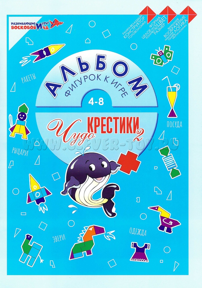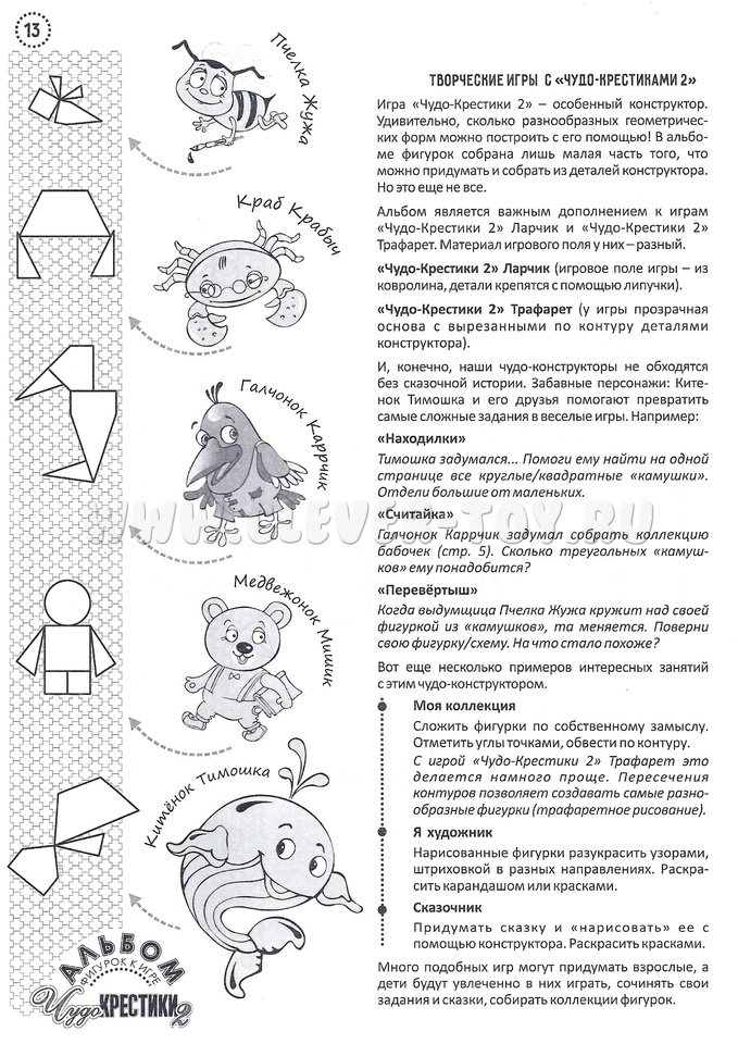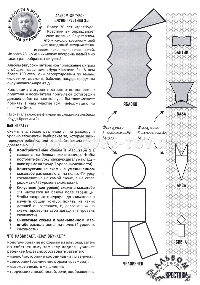 Альбом фигурок – наглядное пособие для игр с конструкторами серии «Чудо-крестики». Имеет неограниченные возможности для проявления творчества и развития ребёнка. Сегодня он складывает фигурки по схемам из альбома, а завтра – уже придумывает свои, развивая фантазию, глазомер, укрепляя начальные знания о математике и геометрии.