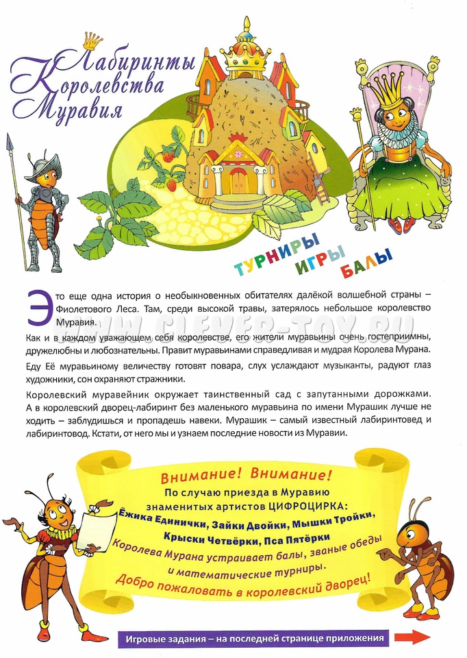 Герои пособия – необыкновенные обитатели королевства Муравия. Королевский муравейник окружает таинственный сад с запутанными дорожками, по которым должен пройти ребёнок, чтобы познакомиться с цифрами и изучить их.