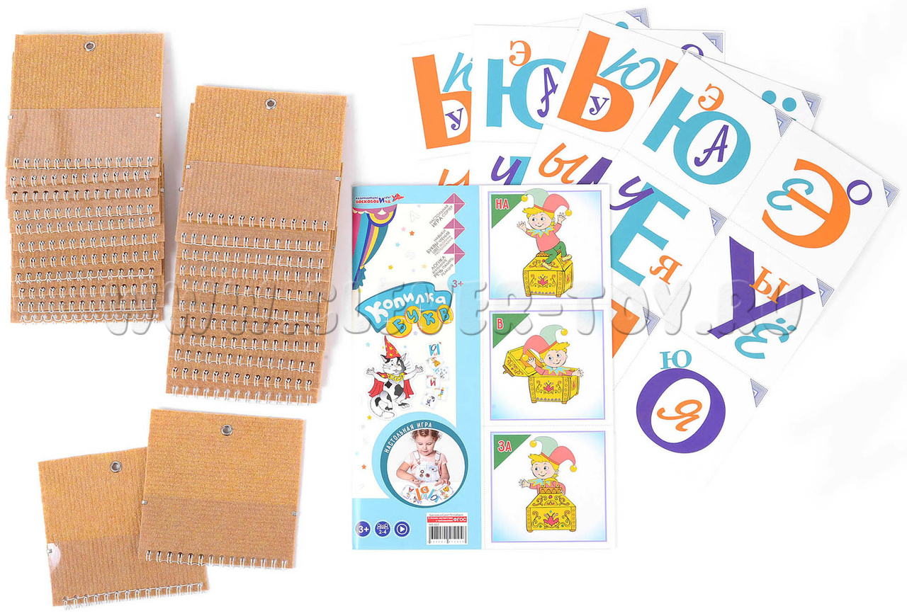 1. 48 картонных карточек (100х100мм): 24 игровых с гласными буквами, 24 призовых, обозначающих цвет, размер, положение (предлоги); цветная инструкция с правилами игр;
