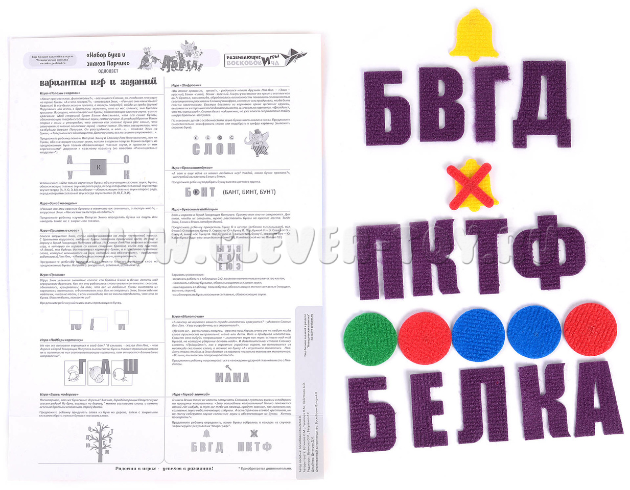 "Набор букв и знаков" используется как "пособие для групповой и индивидуальной работы с детьми в детских садах, развивающих центрах или в домашних условиях. Сочетается с играми и пособиями: "Коврограф Ларчик", "МиниЛарчик", "Фиолетовый лес", "Набор цифр и знаков Ларчик" (дерево/ковролин), "Конструктор букв Ларчик" (ковролин).