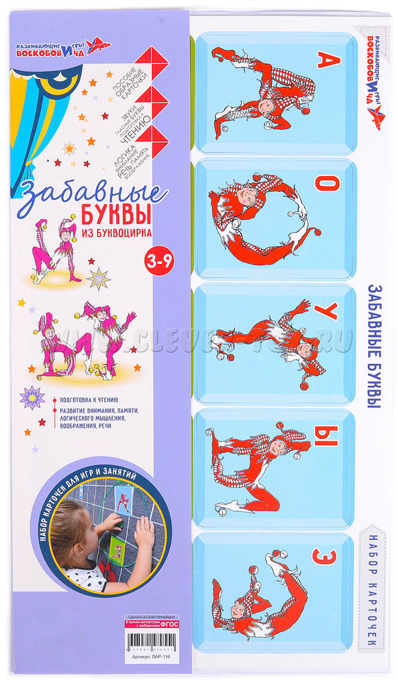 С помощью образных карточек «Забавные буквы», на которых изображены сказочные акробаты-шуты, ребёнок: