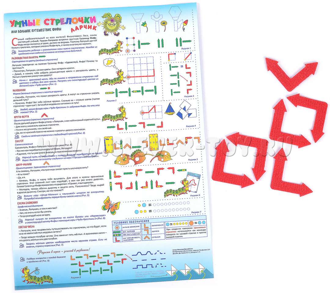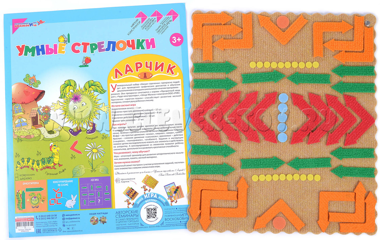 Приложение к «Коврографу Ларчик» для детей от 4 до 9 лет, может использоваться для игр и занятий как в составе набора, так и отдельно от него. «Умные стрелочки» можно использовать совместно с развивающими играми «Шнур-Малыш», «Шнур-Затейник», «Читайка на шариках 1,2», «Конструктор букв 1,2», «Конструктор букв Ларчик», графическим тренажёром «Игровизор» и приложением к нему «Игровой калейдоскоп 1», игровым комплексом «Коврограф Ларчик» с его конструктивными элементами («Разноцветные верёвочки 1,2», «Разноцветные кружки 1,2»), игровым комплектом «МиниЛарчик».