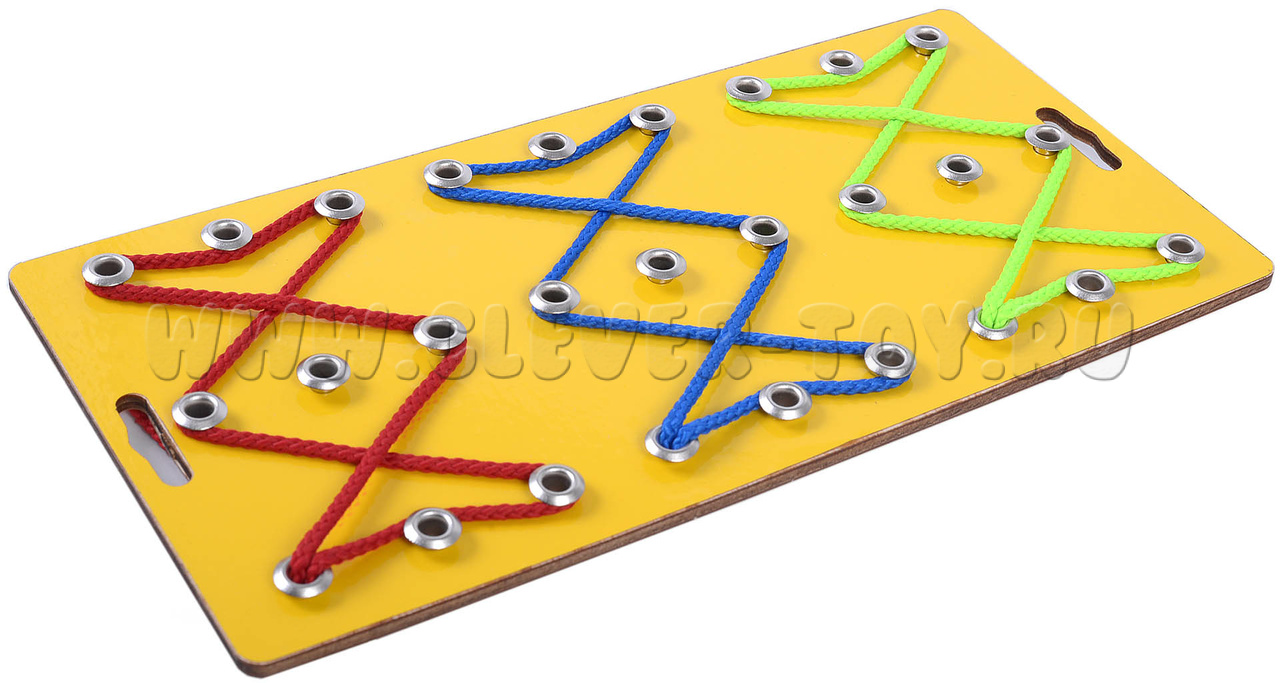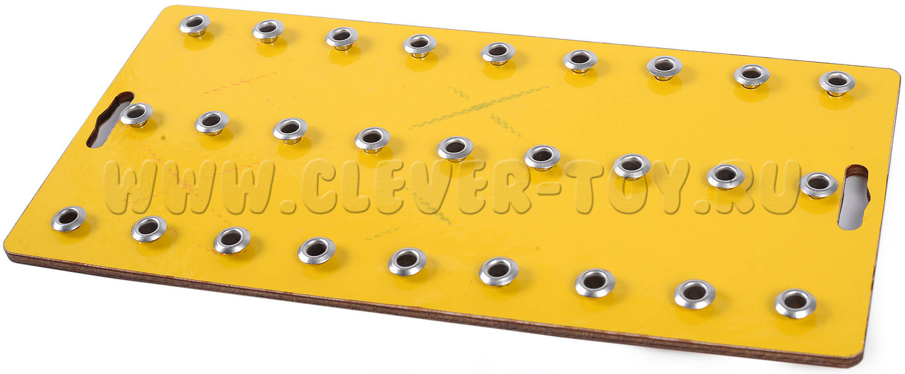 • игровое поле в виде яркой деревянной дощечки с 27 дырочками (кнопками), каждая обрамлена металлическим колечком для удобства продевания шнурков;