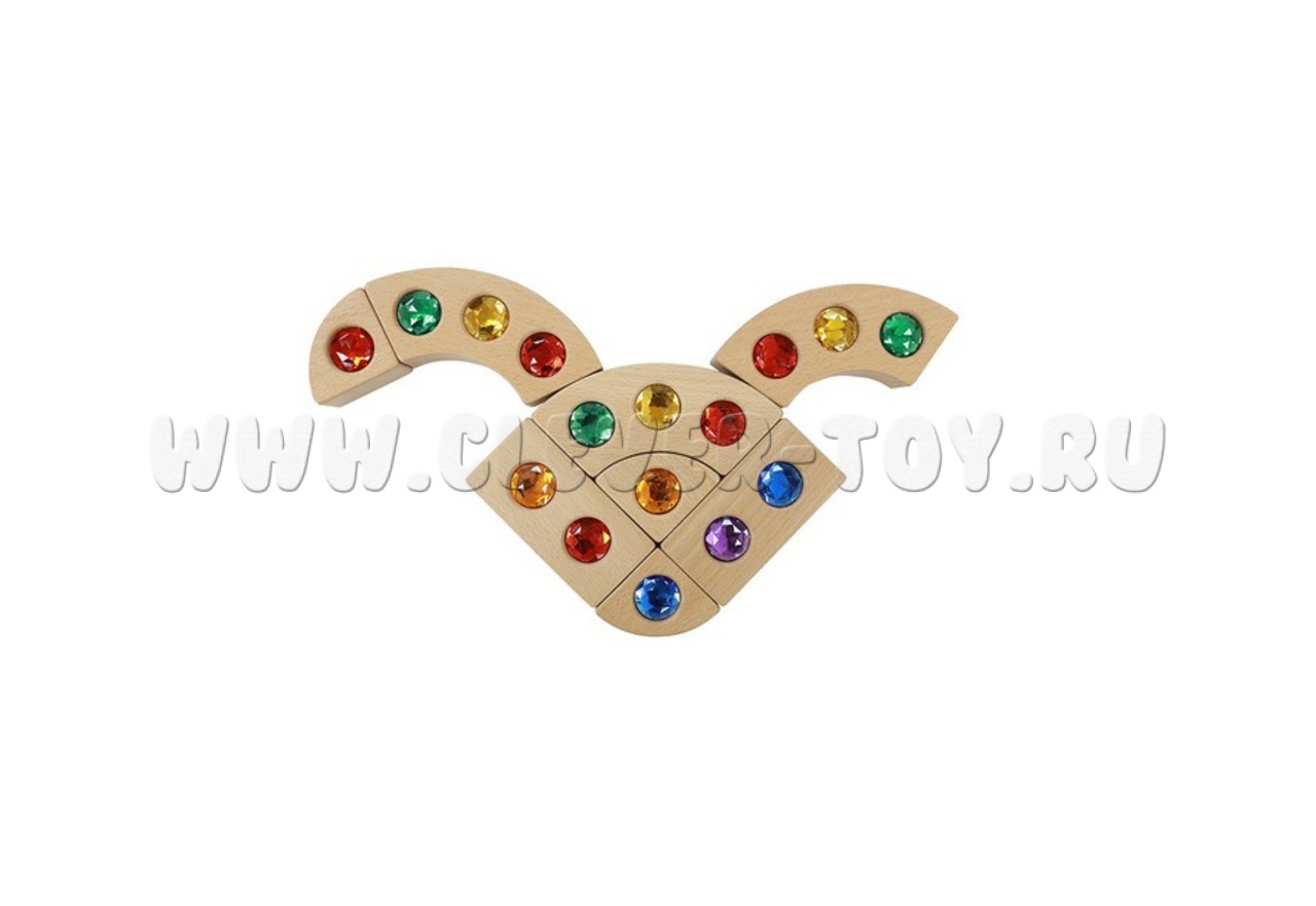 Игра "Набор сокровищ" включает 40 деревянных блоков из бука с яркими акриловыми вставками, похожими на драгоценные камни.