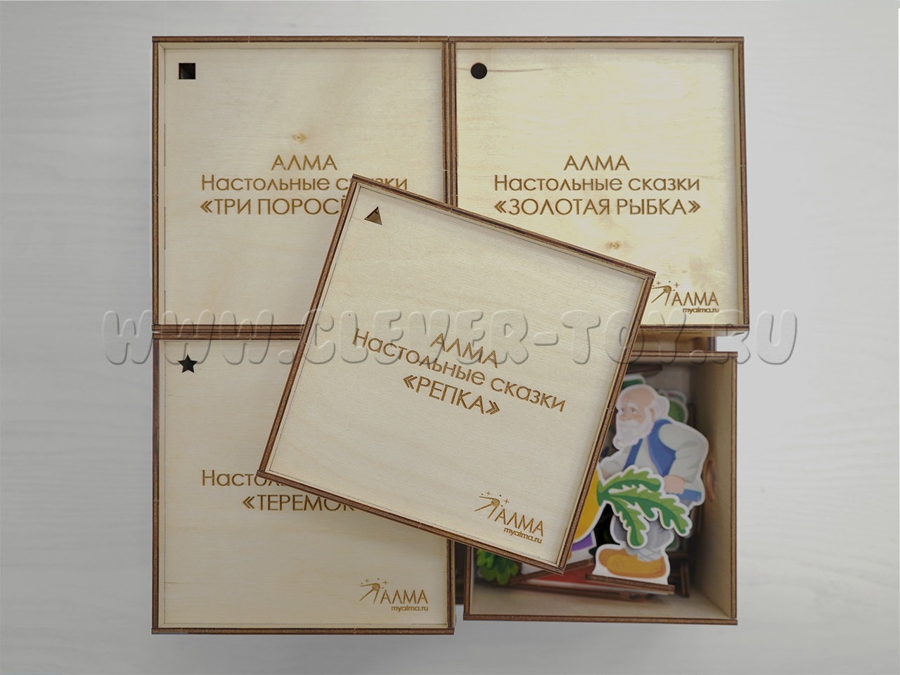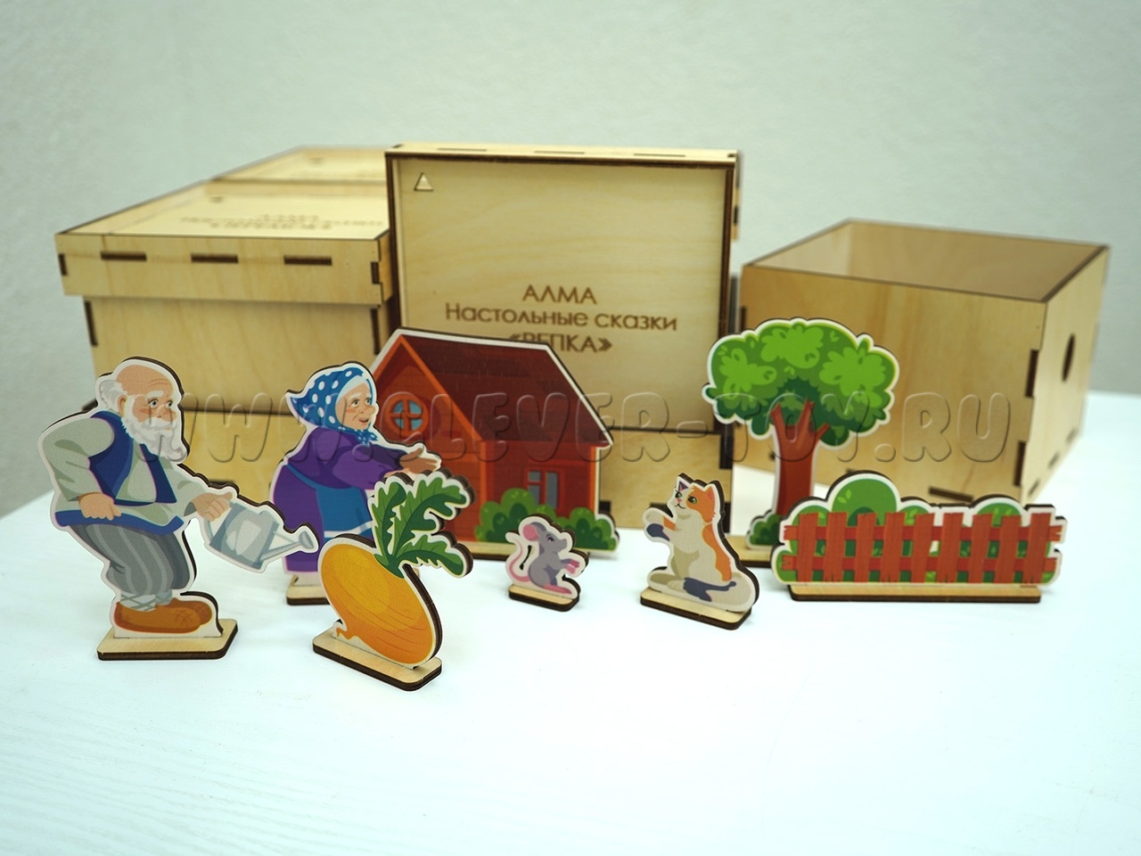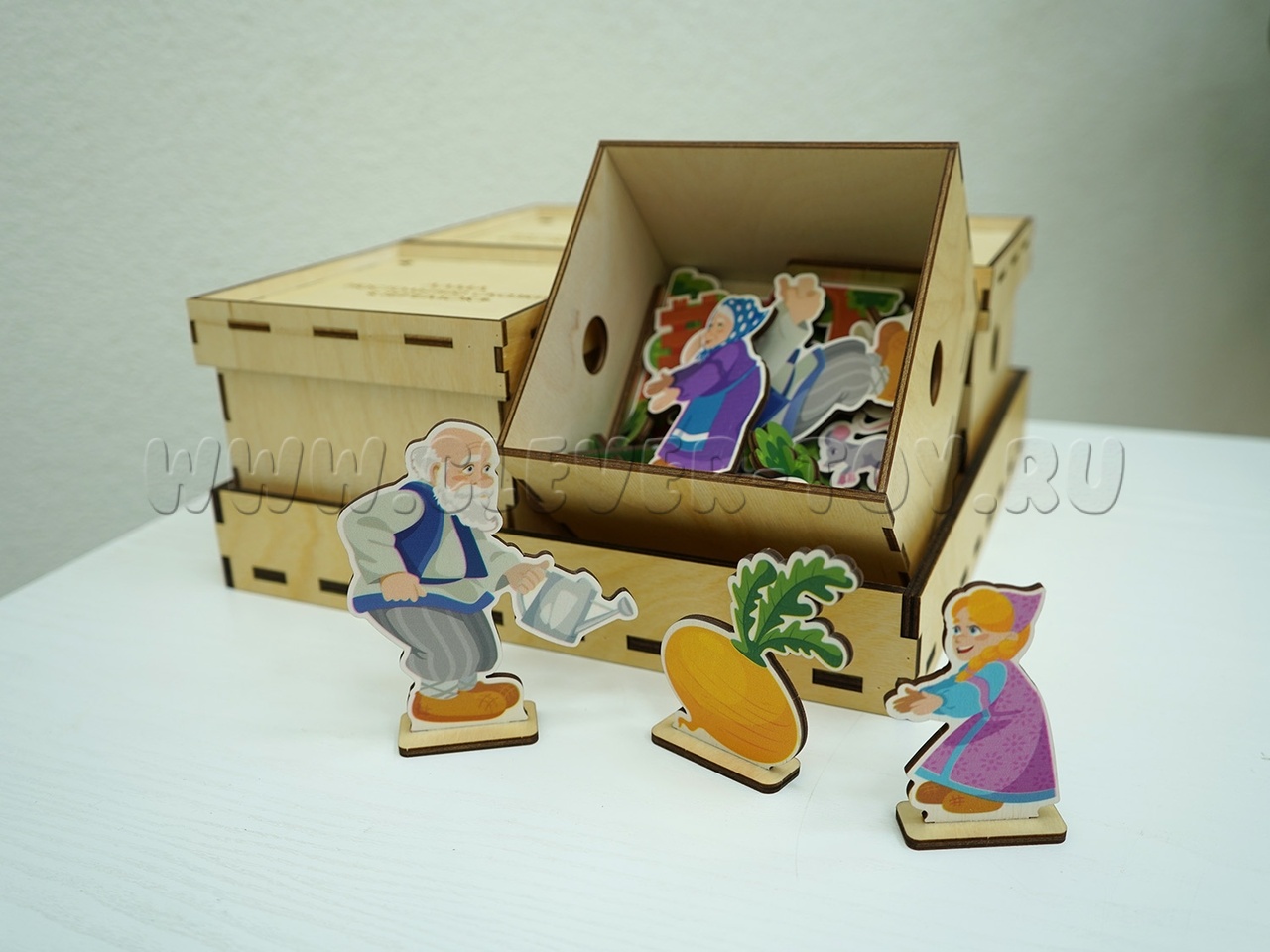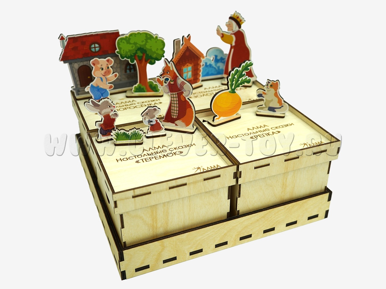 В наборе четыре коробки и подставка, обратная сторона которой является игровым полем. В каждой коробке лежат фигурки персонажей и атрибутов из соответствующей сказки. На крышке каждой коробки находится своя фигура, которая продублирована на подставке персонажей этой истории: данная система не позволит случайно перепутать героев и их сказки.