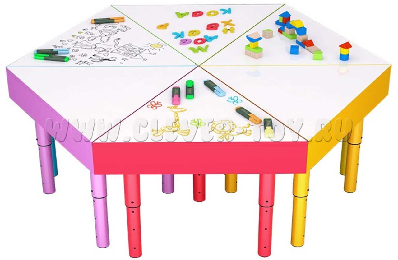 Детский комплекс состоит из 6 треугольных столиков, которые объединены в круг. При такой организации учебного процесса будут задействованы все дети и каждый из них будет чувствовать свою значимость и сможет выразить свои чувства и эмоции.