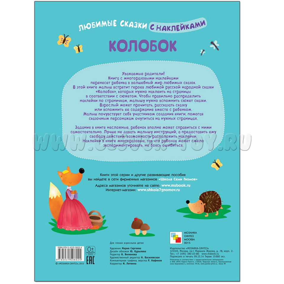 Книга сказок поможет вашей семье провести время с пользой за совместным чтением и перенесет ребенка в мир волшебных сказок. В этой книге малыш встретит героев из русской народной сказки "Колобок", которых нужно наклеить на страницы с определенным сюжетом. Для того, что бы правильно распределить наклейки на странице, малышу необходимо вспомнить сказку.