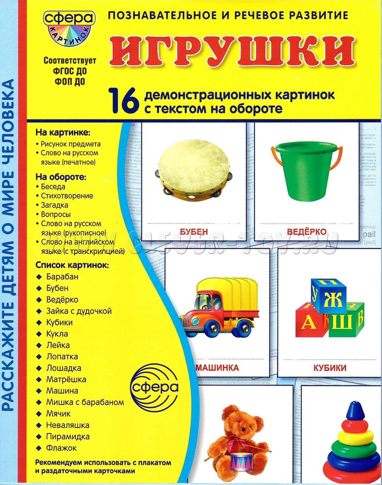 16 демонстрационных картинок для познавательного и речевого развития. На обороте каждой предметной картинки - описание, стихотворение, загадка, вопросы для ребёнка, название на русском и английском языках.
