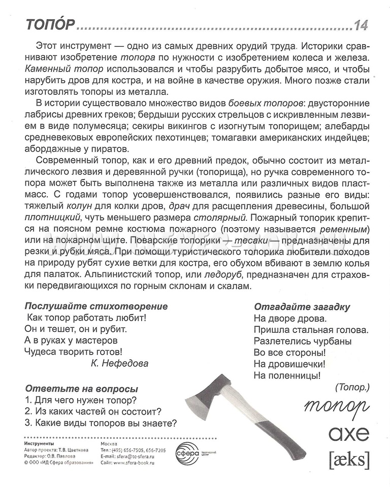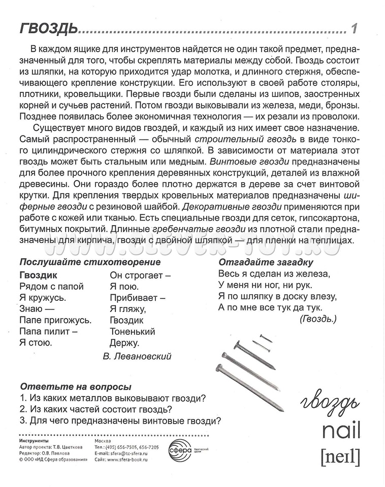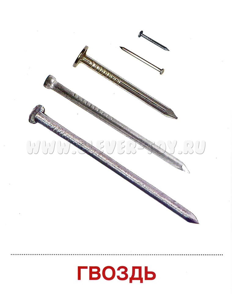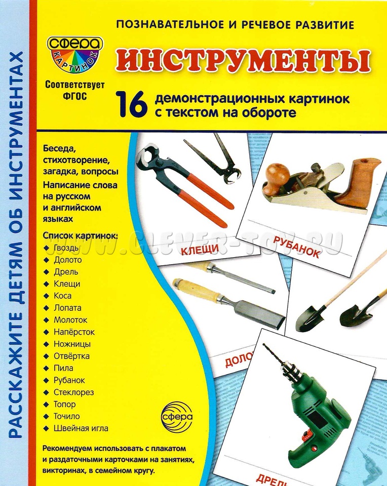 Состав комплекта (16 карточек): Гвоздь, Долото, Дрель, Клещи, Коса, Лопата, Молоток, Напёрсток, Ножницы, Отвёртка, Пила, Рубанок, Стеклорез, Топор, Точило, Швейная игла.