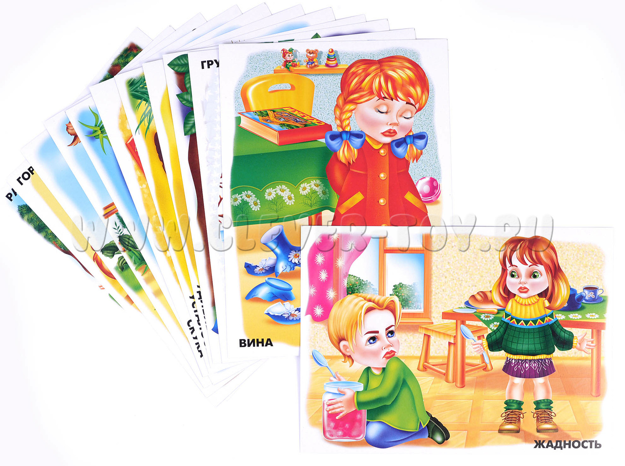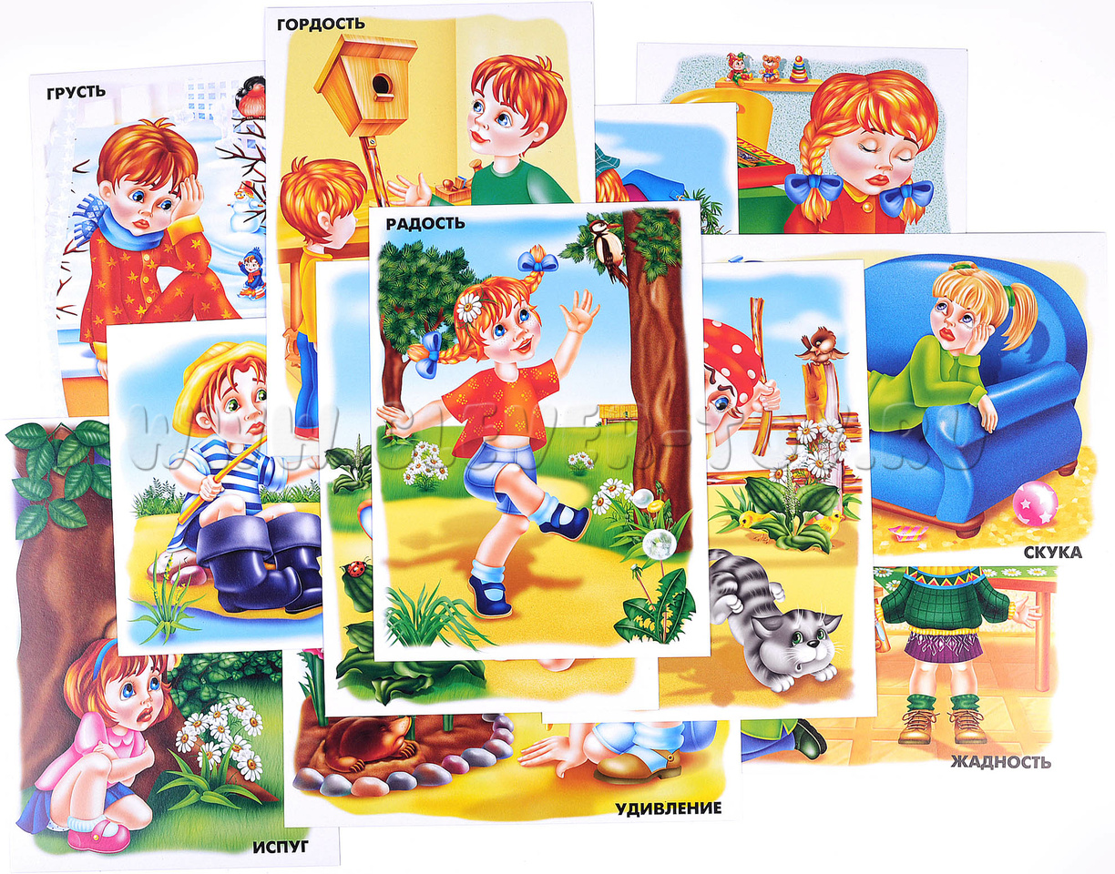 В состав набора входит 12 ярких изображений формата А4, наглядно иллюстрирующих те или иные эмоции (вина, усталость, гордость и т.д.) и папка для хранения материалов.