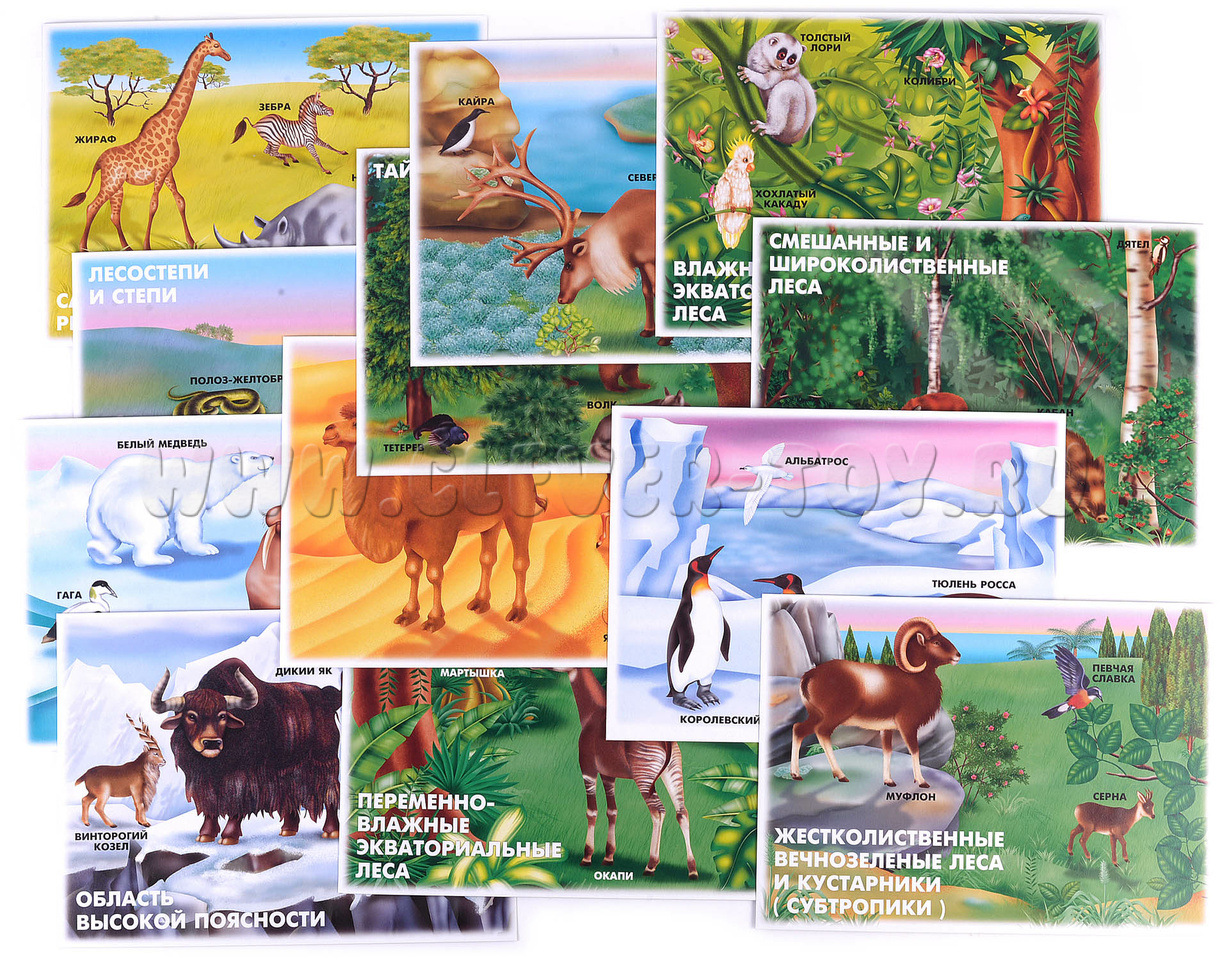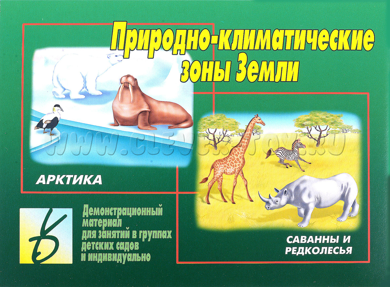 Предлагаем демонстрационный материал, знакомящий детей с природно-климатическими зонами на нашей планете. На картинках изображены обитатели этих зон и среда обитания, климат, в котором они проживают. Познавательная игра подходит для занятий в группах детского сада, а также индивидуально.