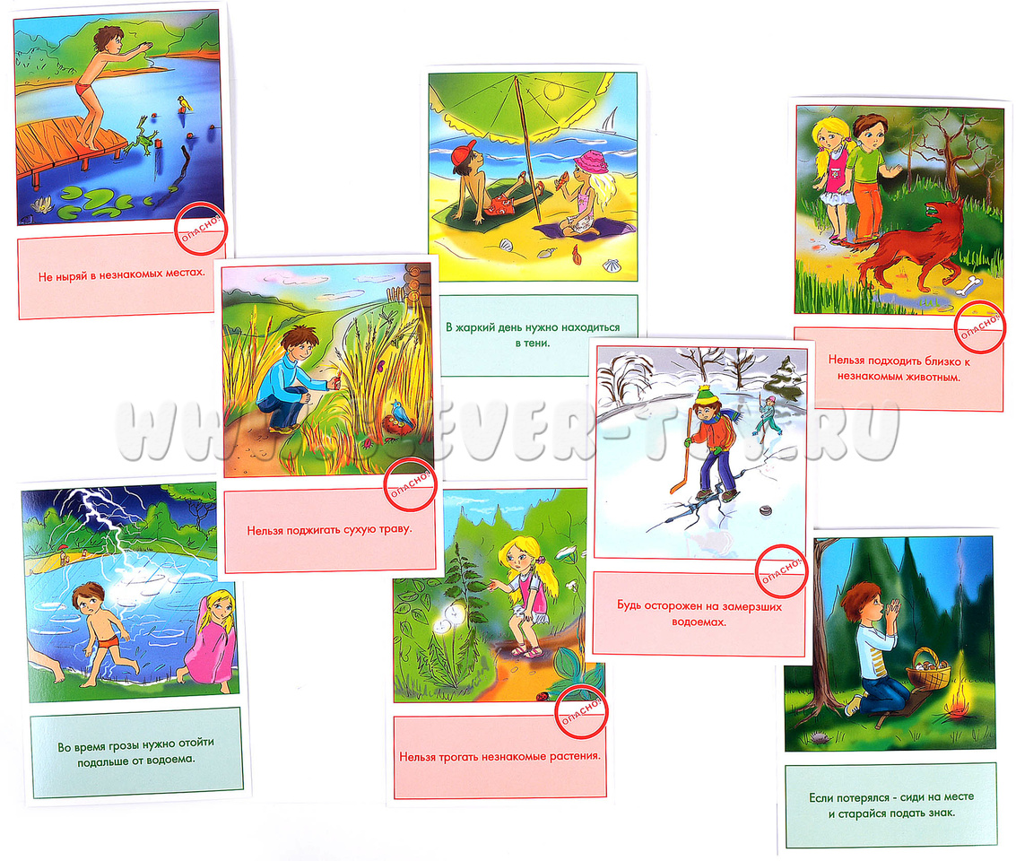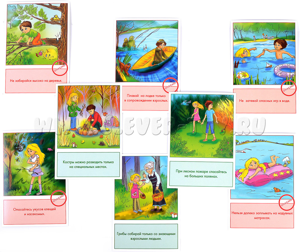 Наглядные карточки от ООО "Маленький гений" познакомят ребёнка с правилами безопасного поведения на природе: