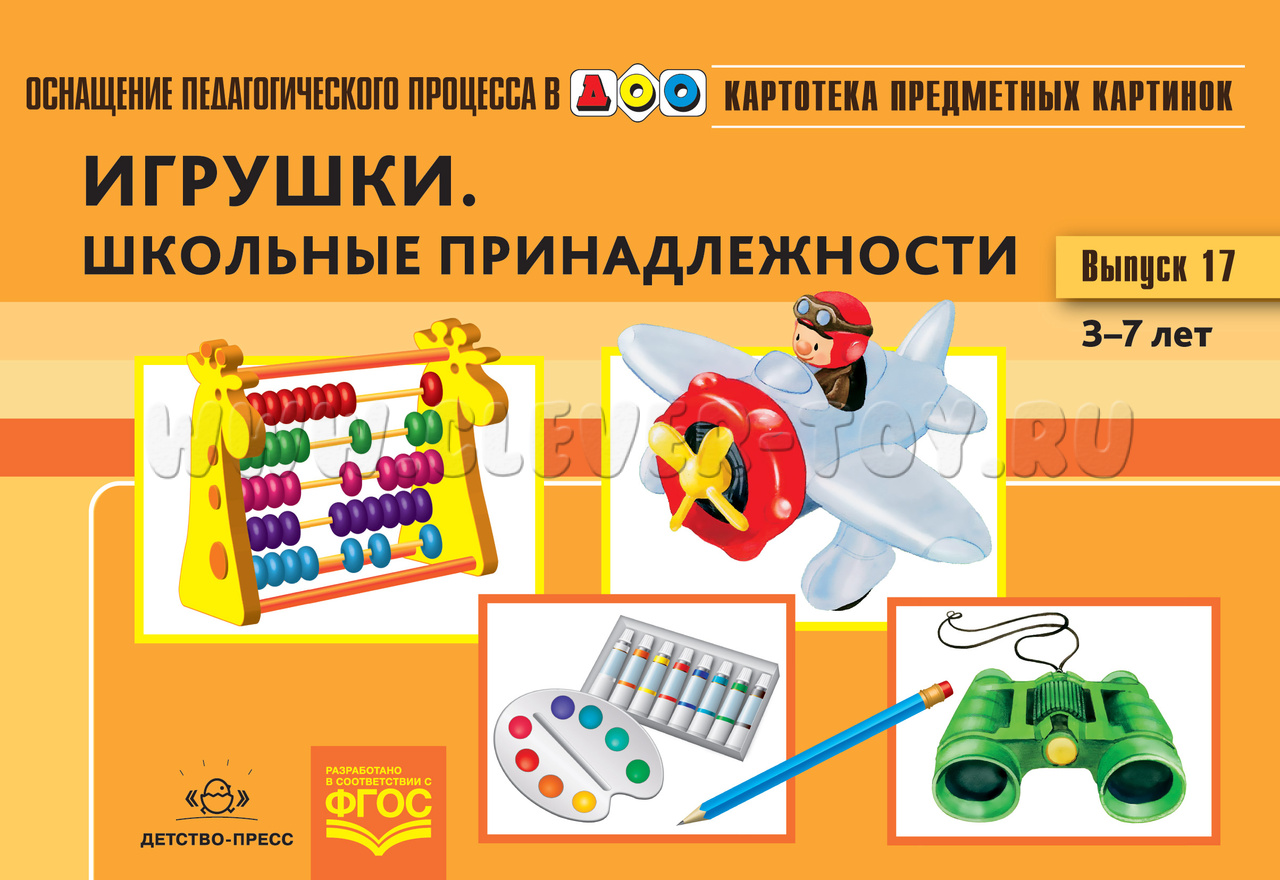Картотека предметных картинок №17. "Игрушки. Школьные принадлежности". 3-7 лет. ФГОС. Дидактический материал.