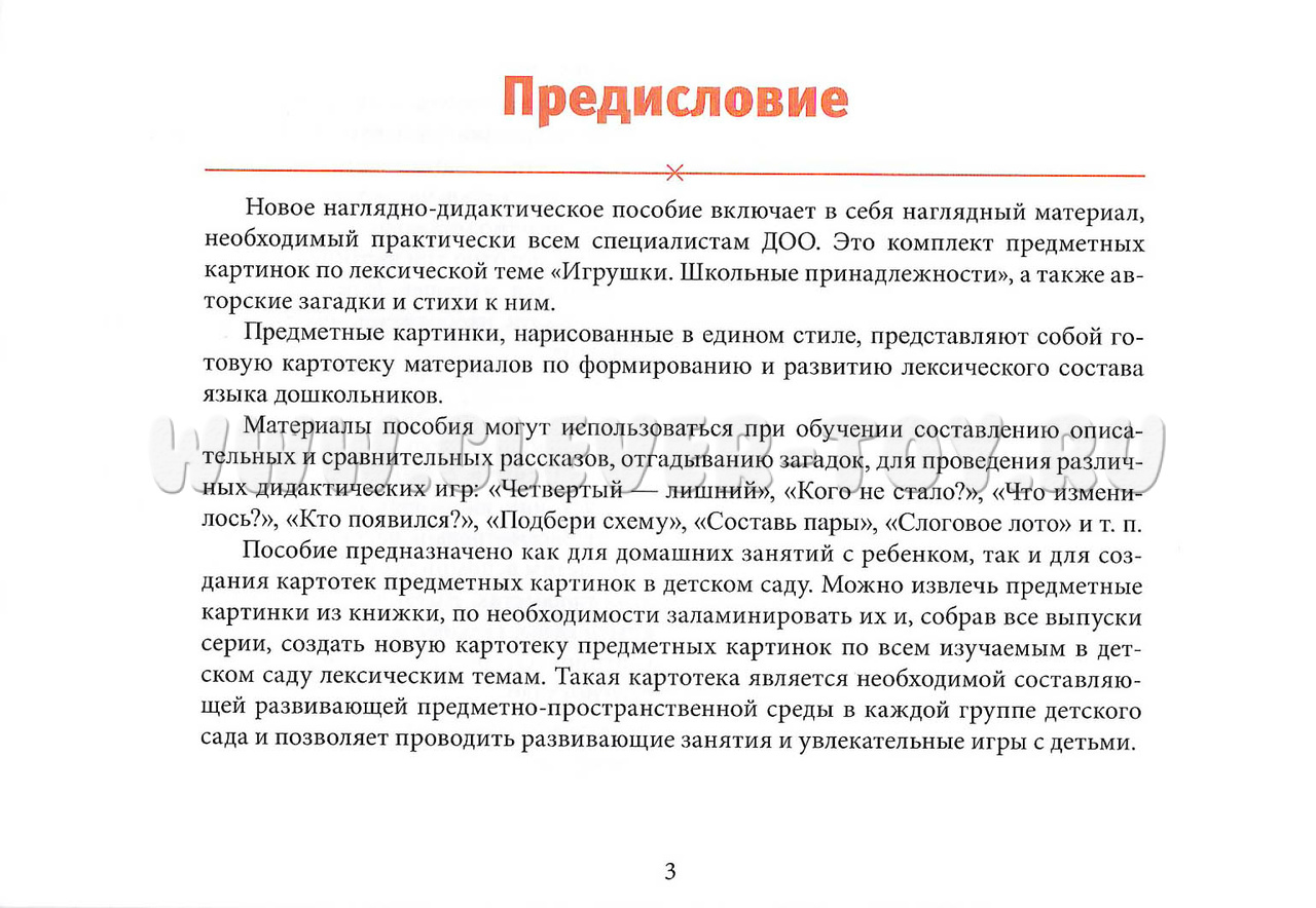 Пособие включает в себя наглядный дидактический материал для специалистов ДОО. Комплект предметных картинок по лексическим темам "Игрушки", "Школьные принадлежности", а также авторские стихи и дидактические игры с использованием материалов пособия. Пособие предназначено как для домашних занятий с ребенком, так и для создания картотек предметных картинок в детском саду.