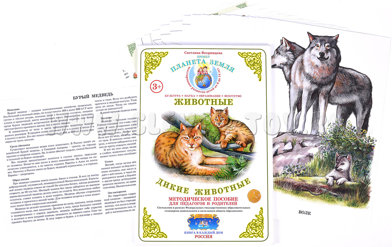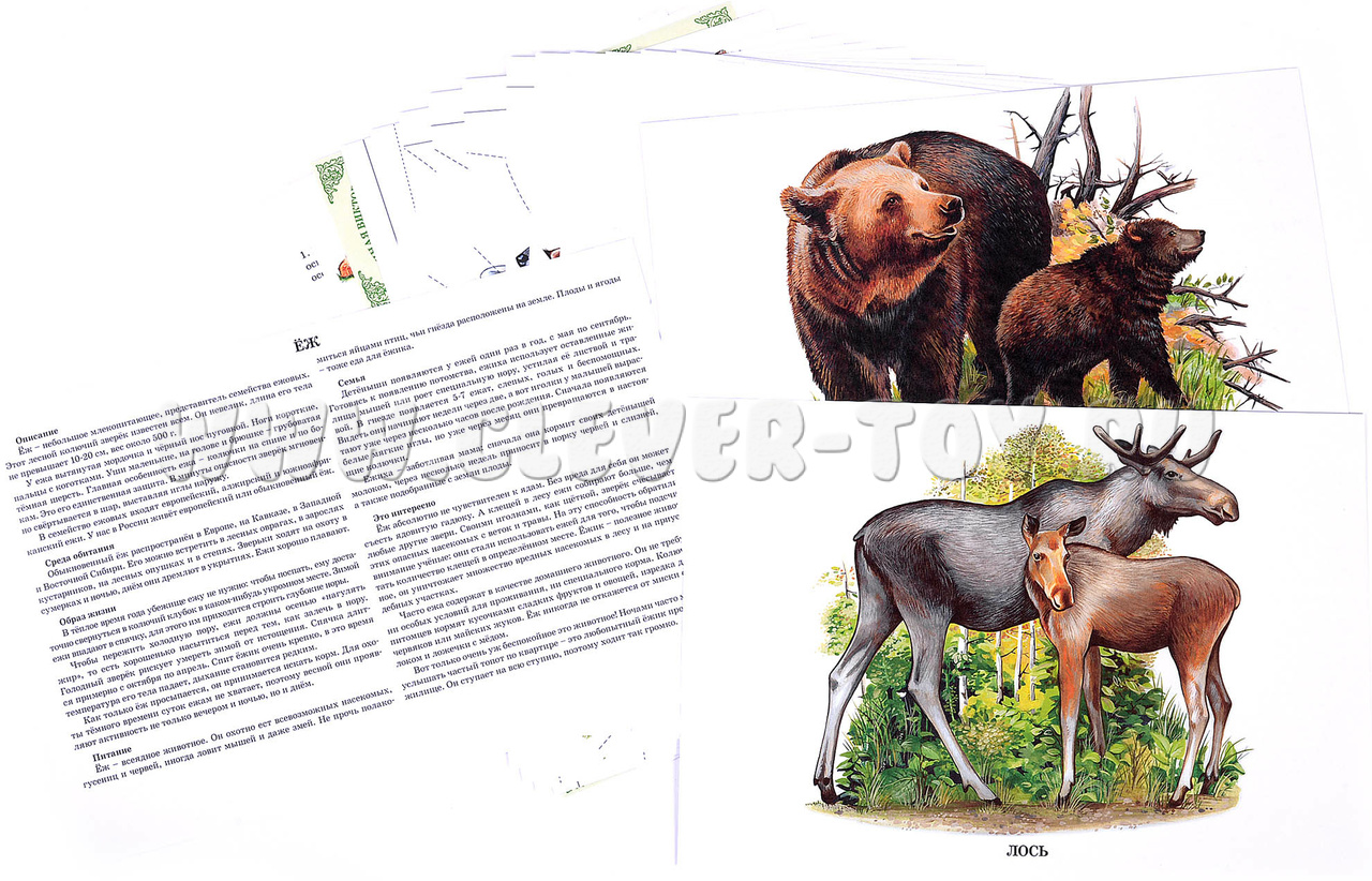 - 10 натуралистичных изображений диких животных (Ёж, бурый медведь, лось, волк, заяц, белка, олень, лиса, рысь, барсук), на обратной стороне - их описание, ареал обитания, особенности поведения, питания, образа жизни;