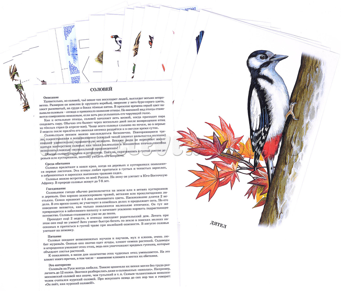 • 10 реалистичных изображений птиц разных видов, на обороте - описание, ареал обитания, особенности поведения, питания, интересные факты;