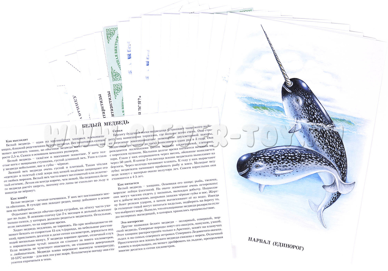 • 10 реалистичных изображений животных, на оборотной стороне каждого - внешний вид животного, ареал обитания, особенности поведения, интересный факт, связанный с животным;