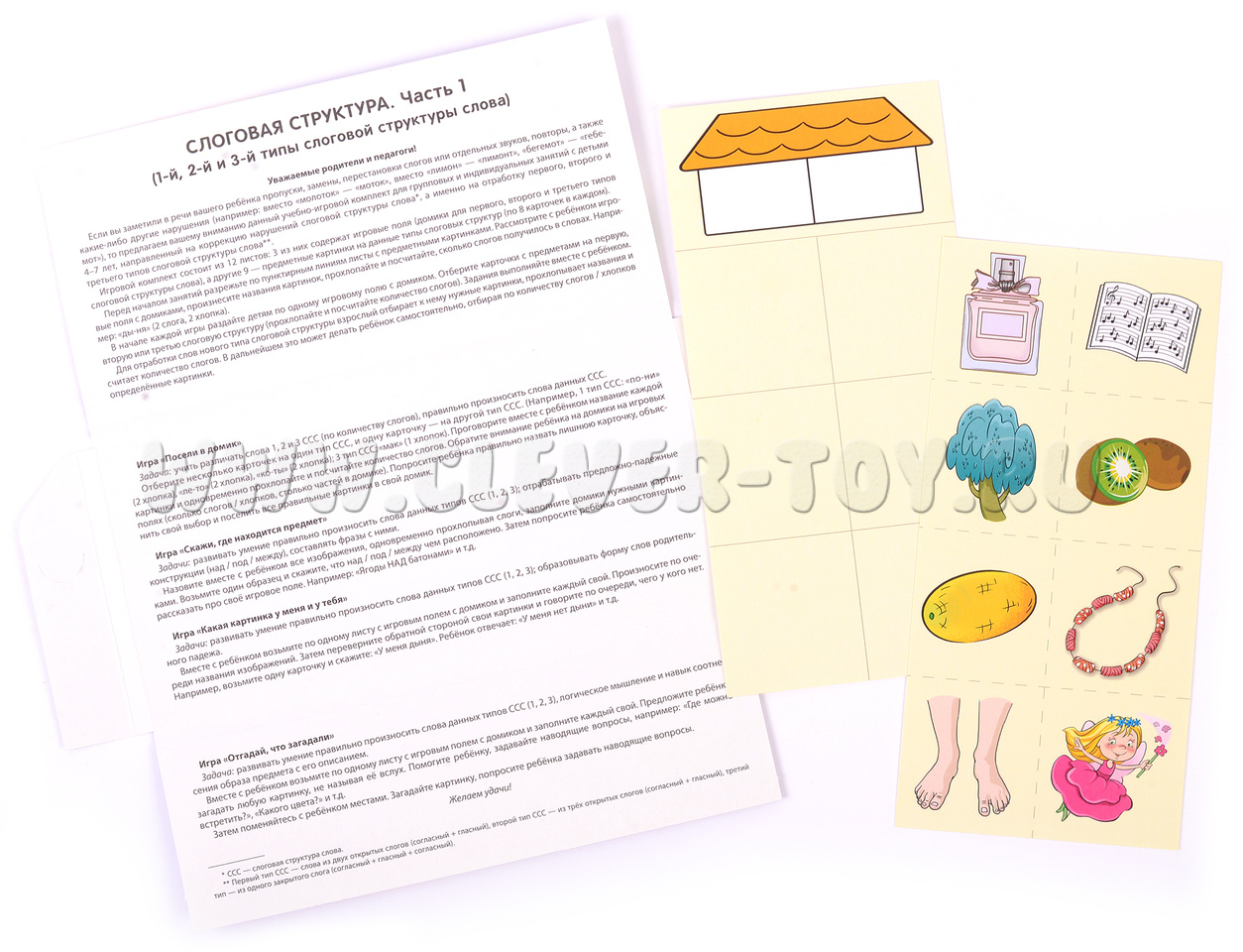Комплект "Слоговая структура. Часть 1" - это 12 листов, наполненных 75 карточками и 4 увлекательными играми, разработанными специально для детей в возрасте от 4 до 7 лет. Задания в игровой форме помогут детям исправить нарушения слоговой структуры слова, включая работу с первым, вторым и третьим типами слоговой структуры.