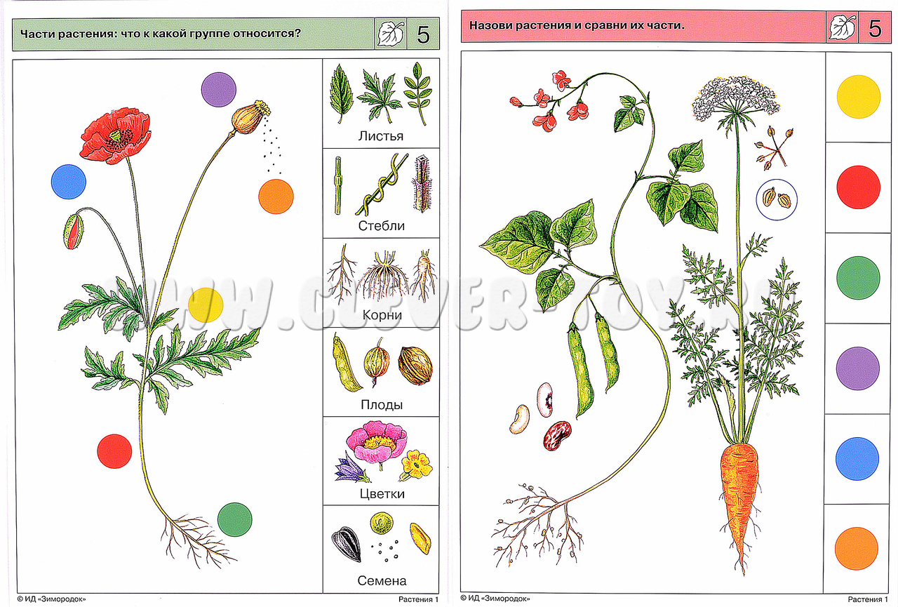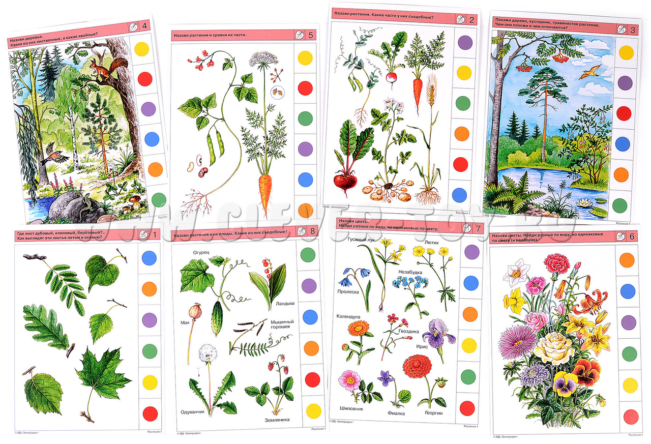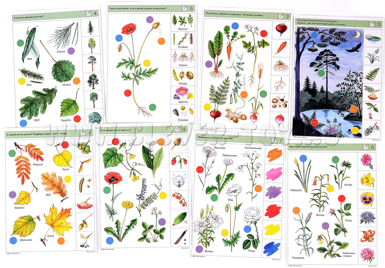 В процессе решения заданий ребёнок будет не только узнавать и называть новые и уже хорошо ему известные виды растений, но и называть их отдельные части, подбирать пары лист-плод и вершки-корешки, верно выстраивать этапы развития растений, искать различия и общие признаки у разных видов. Задания по теме равномерно распределены на два комплекта карточек Растения (1) и Растения (2), и не повторяются. Примеры заданий в карточках: 1а. С какой ветки детки? Подбери пары: лист – плод. 2а. Путаница: вершки и корешки. Исправь ошибки. 3б. Покажи дерево, кустарник, травянистое растение. Чем они похожи и чем отличаются? 4а. С какого дерева листок? 4б. Назови деревья. Какие из них лиственные, а какие хвойные?