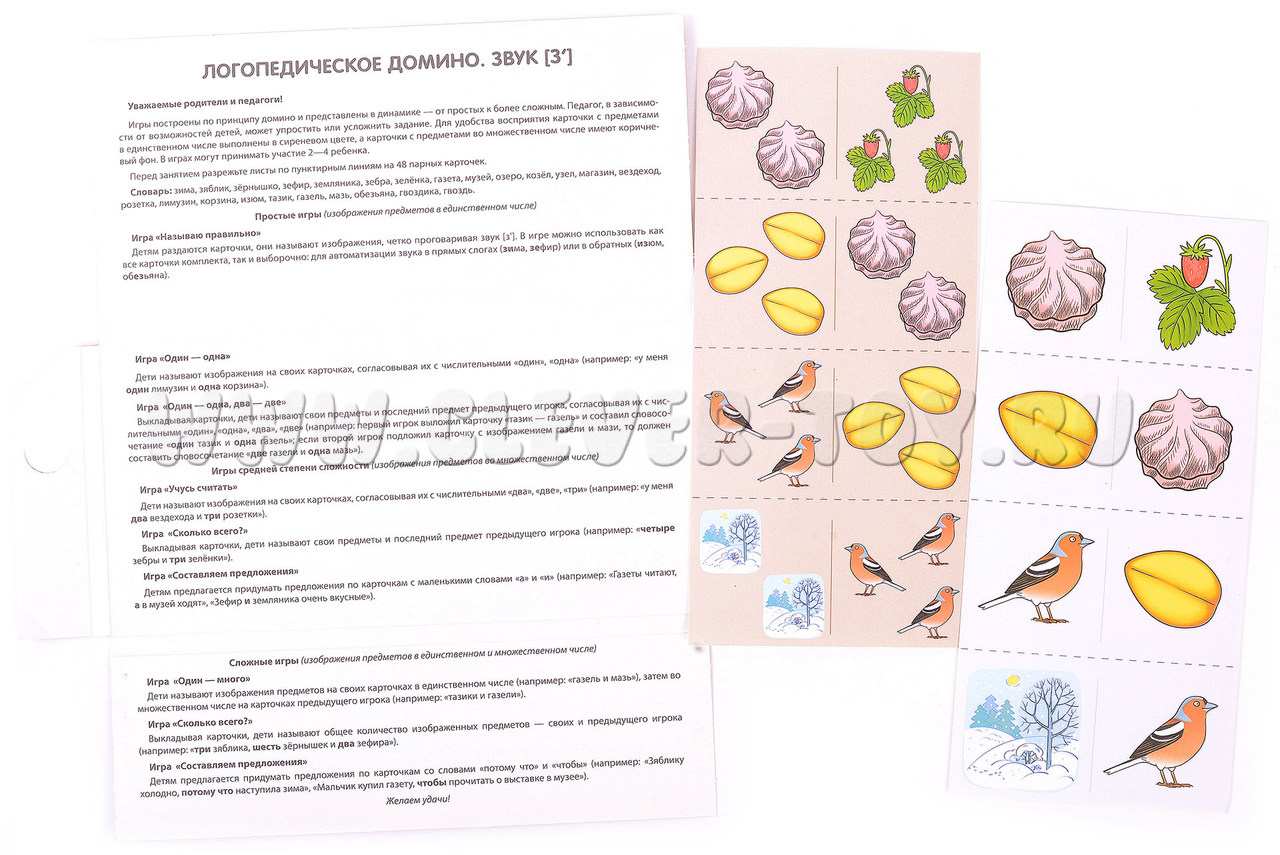 "Логопедическое домино" - это учебно-игровой комплект, состоящий из 12 обучающих карточек с 48 парами цветных картинок. В процессе игры ребёнок научится правильно произносить звук [з’], а также образовывать форму множественного числа существительных и согласовывать их с числительными и прилагательными.