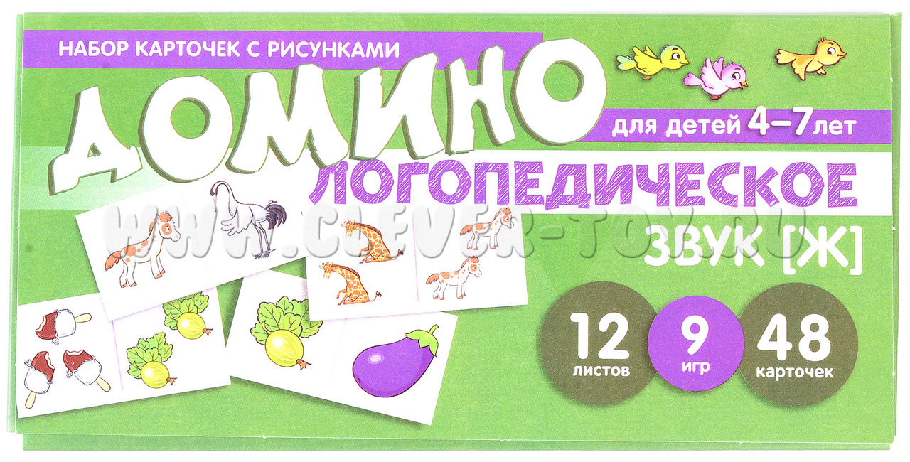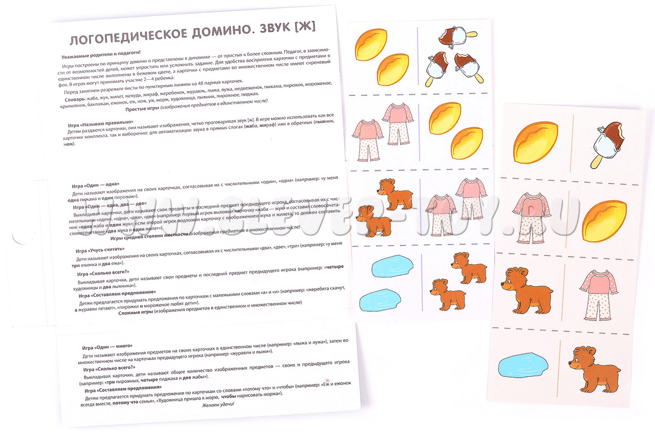 "Логопедическое домино" - это учебно-игровой комплект, который состоит из 12 обучающих карточек с 48 парными цветными картинками. С помощью этого набора ребёнок сможет в игровой форме научиться правильно произносить звук [Ж], образовывать форму множественного числа существительных и согласовывать их с числительными и прилагательными.