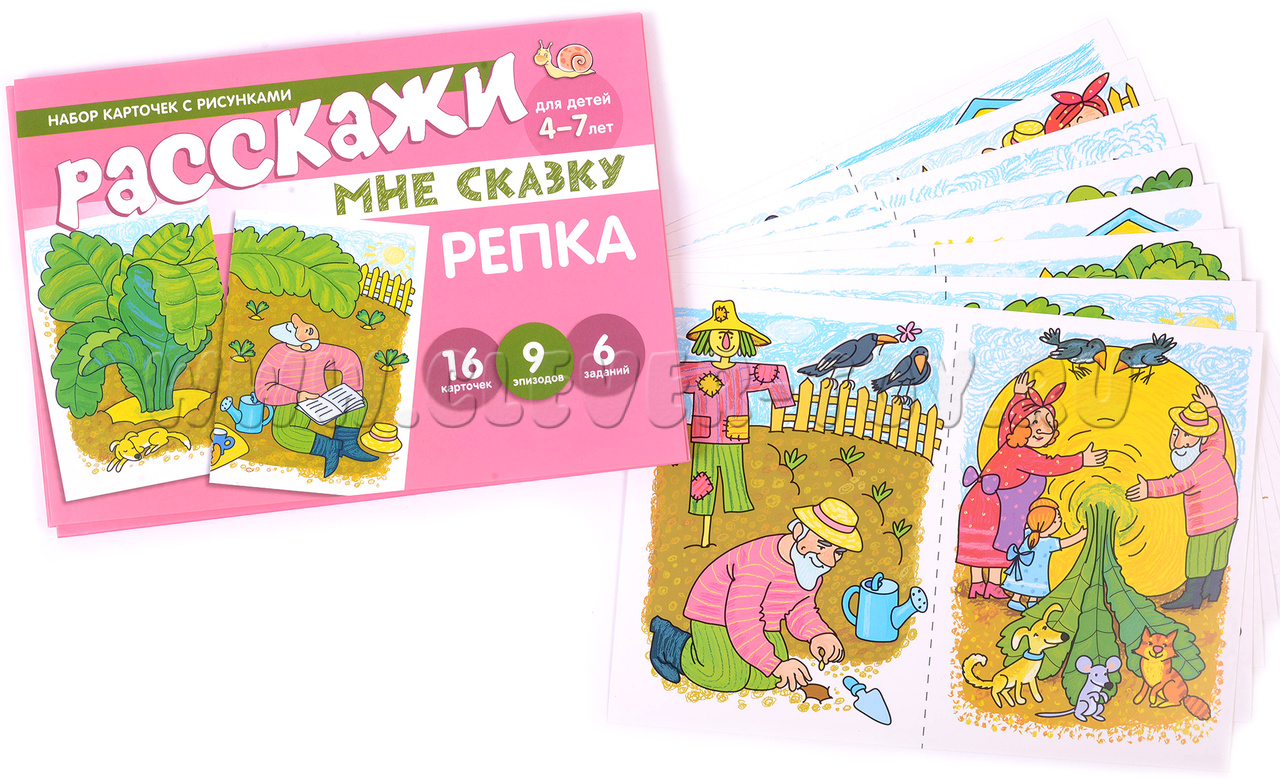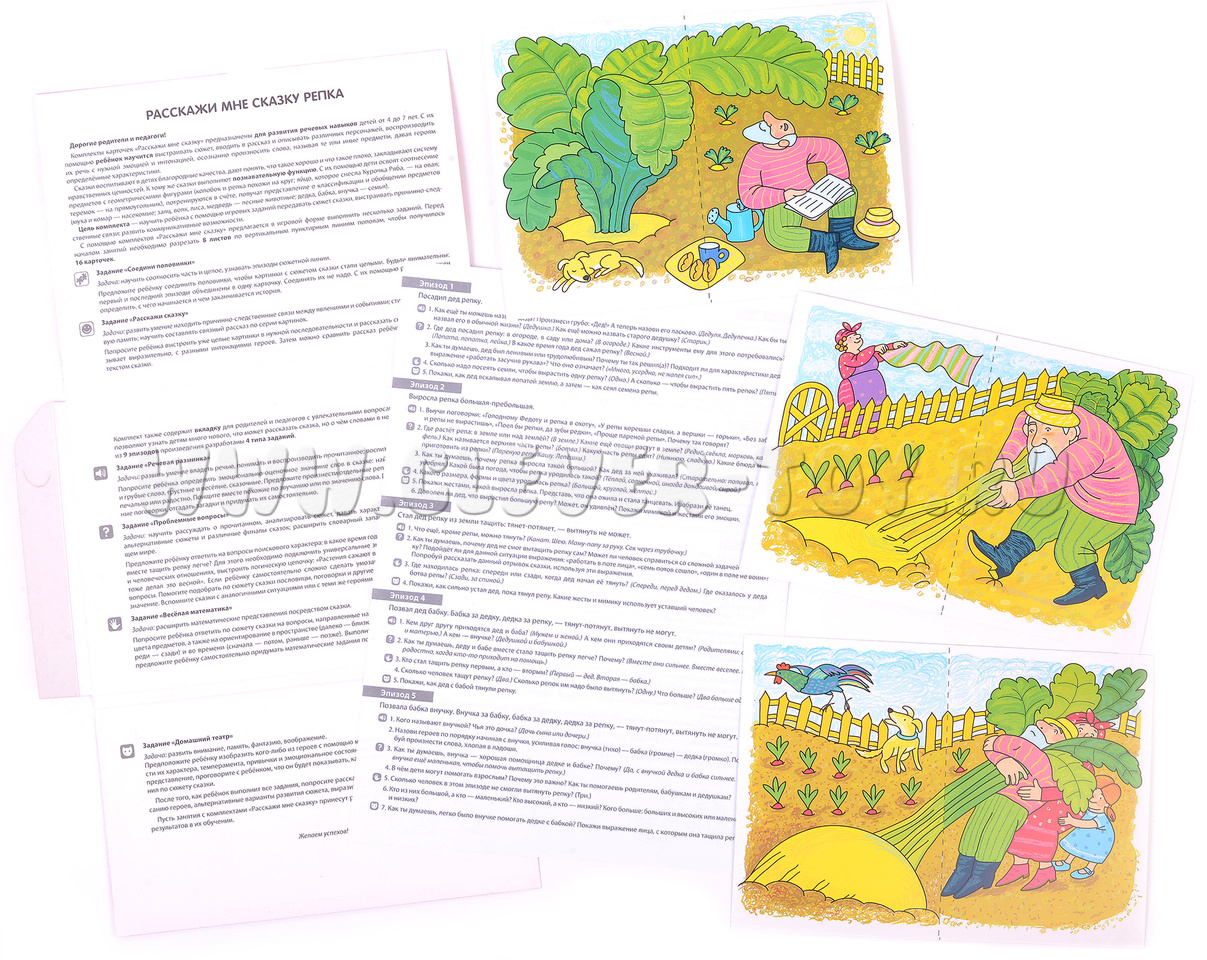 Комплект карточек "Расскажи мне сказку РЕПКА" представляет собой 8 разрезных листов и вкладку с заданиями и вопросами для детей, адресованную родителям и педагогам. Он дарит возможность собрать и выстроить сюжет хорошо известной ребёнку сказки, рассказать и показать её, выполняя разнообразные интересные задания. Учебно-игровой комплект научит детей: - сравнивать и сопоставлять слова, предметы, ситуации; - ставить себя на место персонажей; - выражать чувства и эмоции с помощью телодвижений; - использовать в речи различные по смыслу и стилю слова; - подходить к построению рассказа творчески и с воображением. Желаем увлекательных занятий!