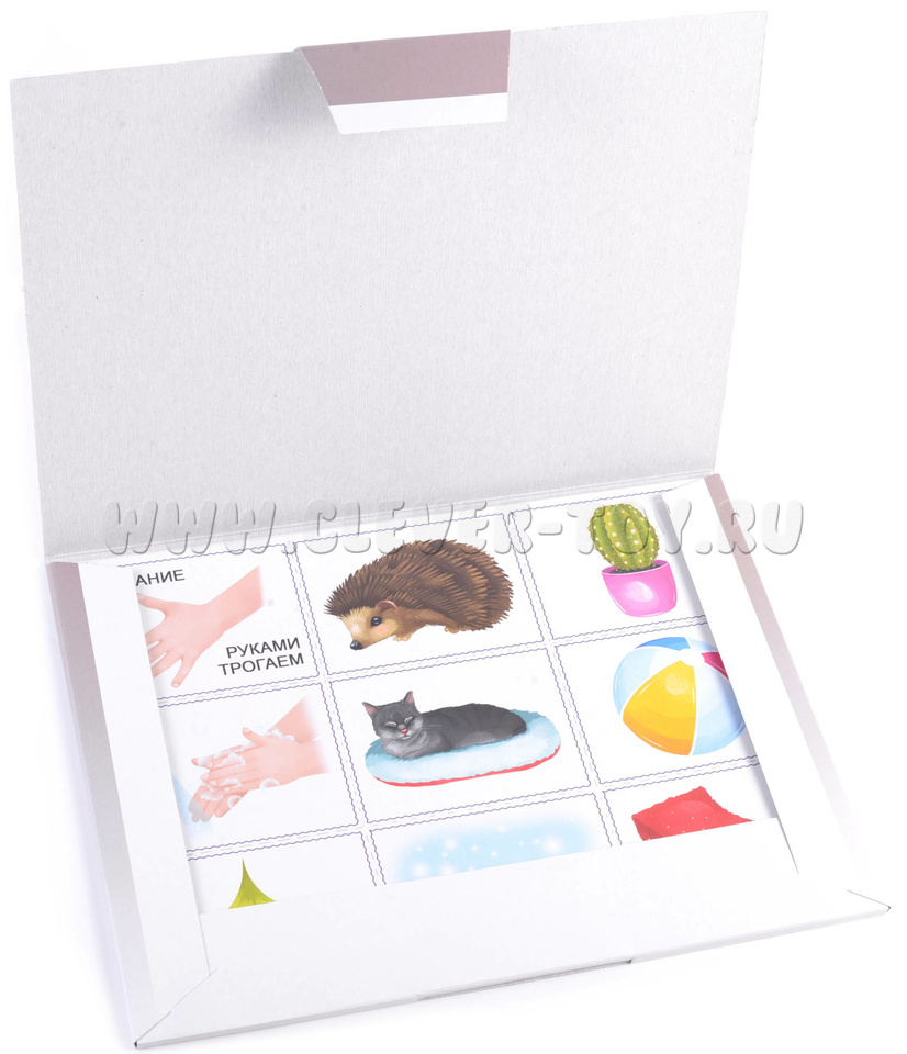Перед началом игры нужно разрезать карты по пунктирным линиям (получится 9 больших карт с действиями детей, 54 карточки с точками, 45 картинок в рамочках).
