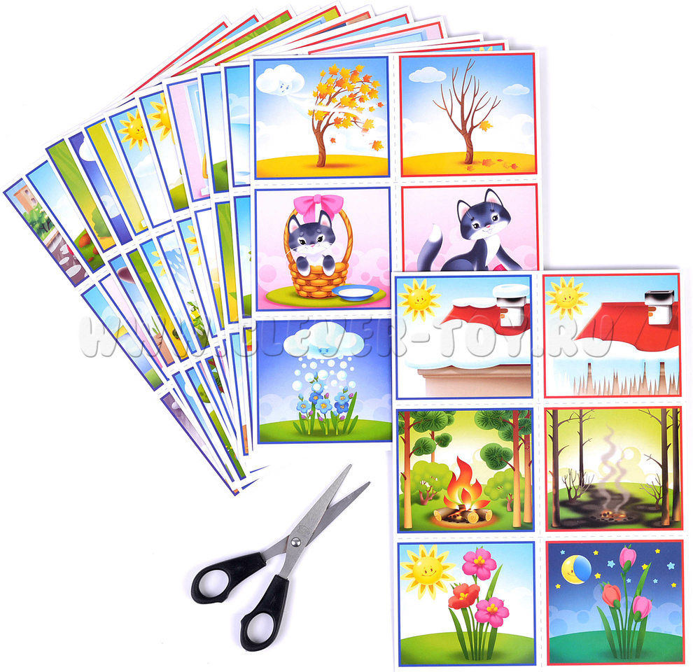 Если играют несколько детей, нужно раздать карточки в синих рамках поровну. Затем ведущий показывает поочерёдно карточки в красных рамках. Те дети, которым они подходят по смыслу, берут их себе, составляя пары из двух карточек (в синей и красной рамке). Когда все пары подобраны, дети рассказывают о том, что изображено на каждой паре карточек и какая связь между этими явлениями. Выигрывает тот, кто правильно собрал все пары карточек и рассказал о них.