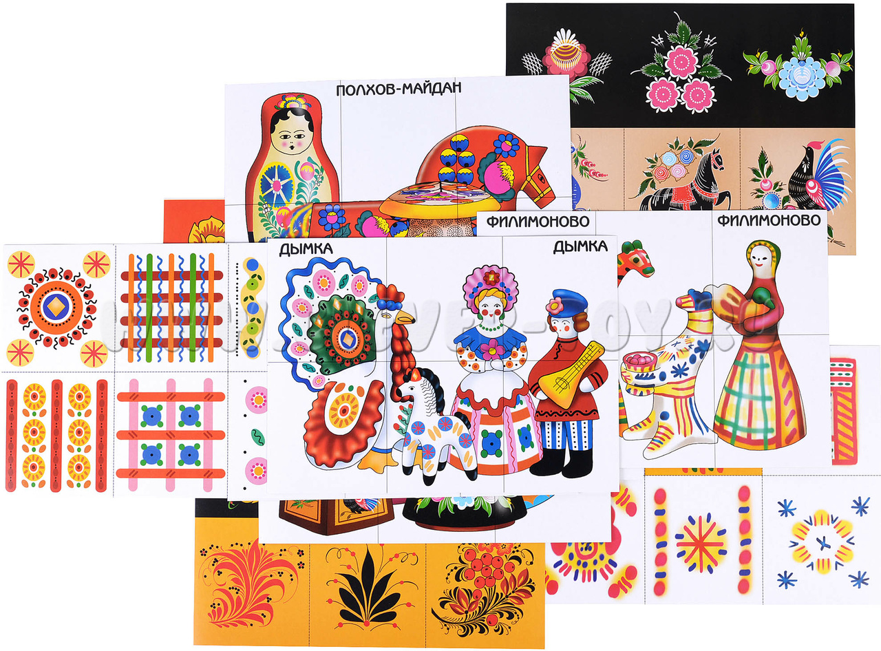 Количество: 6 больших карт с узорами народных промыслов (по 1 на каждый, карты подписаны, нанесена разметка); 6 разрезных карт с узорами (по 1 на каждый промысел, по 6 узоров на каждой карте, всего 36 карточек)