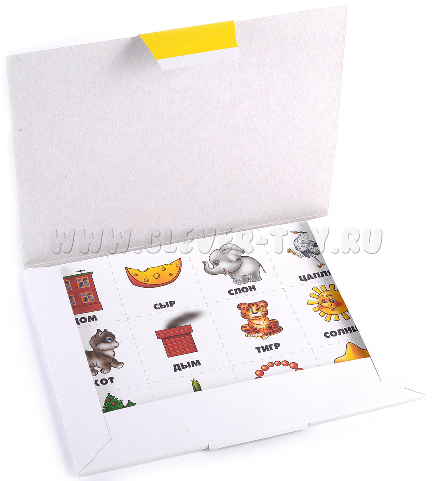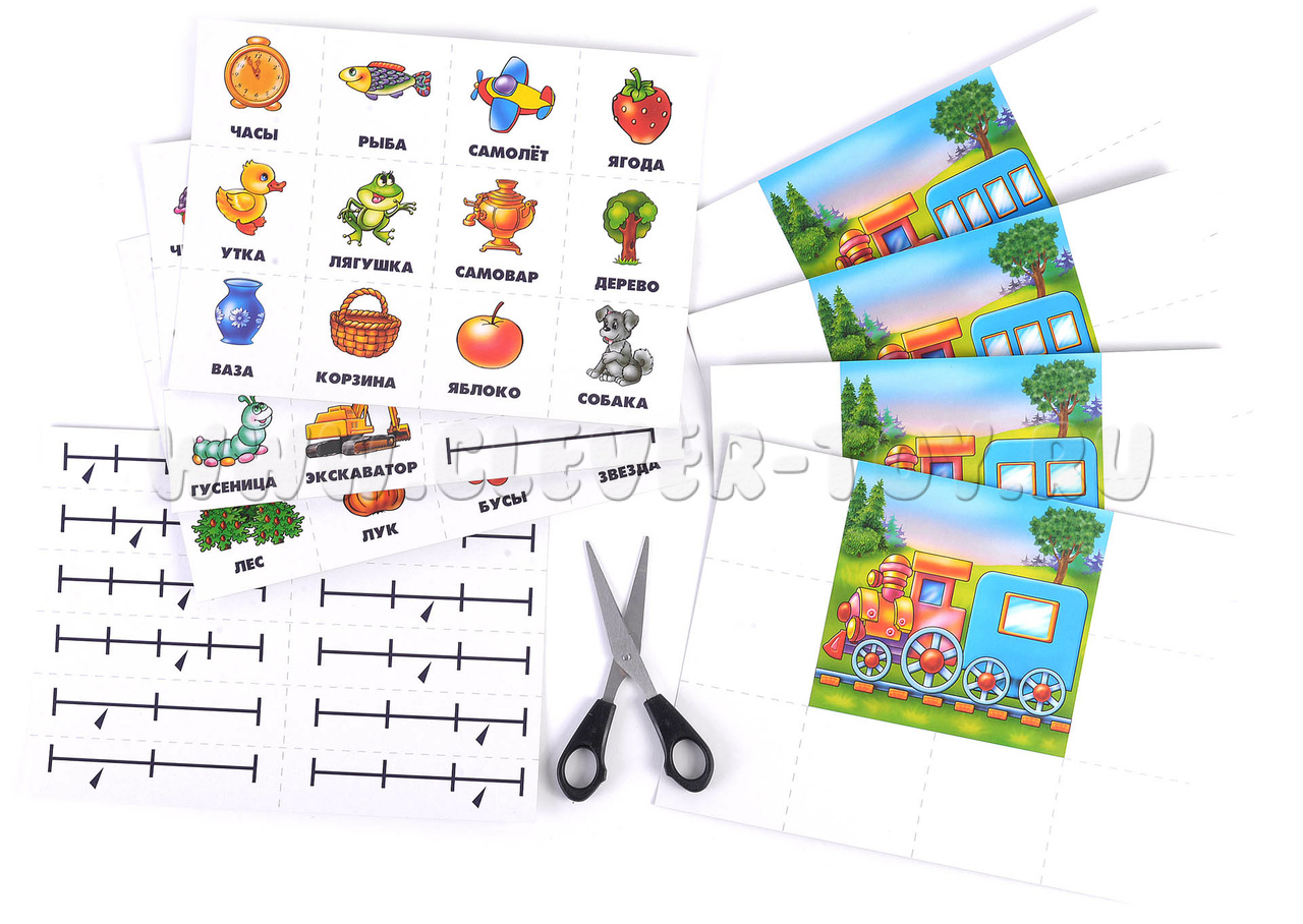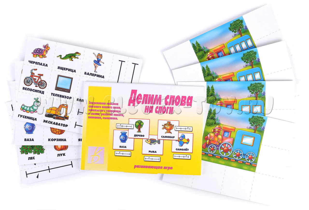 Обучающая игра для детей 5-7 лет. С помощью этой игры ребята закрепляют навыки чтения, слогового анализа слова, знакомятся с ударением в словах, развивают восприятие, призвольное внимание, память и мышление. Перед началом игры требуется разрезать карты по пунктирным линиям (получится 4 больших карты, 32 карточки с картинками и 16 со схемами).