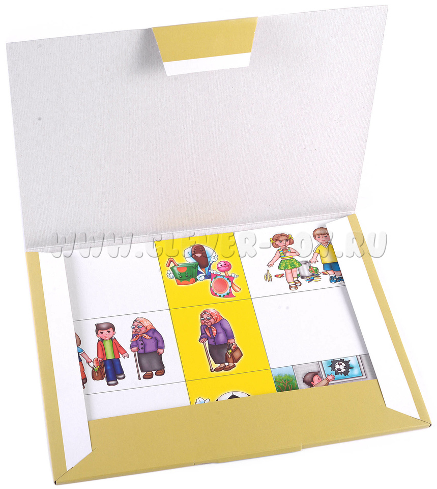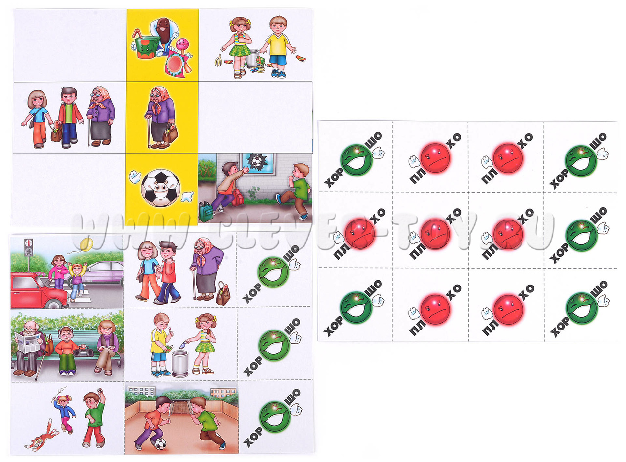 1 игра. Перед началом игры поговорите с ребёнком о том, что означают понятия «хорошо» или «плохо». Малыши должны дать развёрнутый ответ. Возьмите большие карты, где в центральном столбике изображены темы, предметы ситуаций, а слева и справа — варианты поведения детей. Ребята должны отследить каждую ситуацию по горизонтали, рассказать, что они наблюдают, и выложить на пустое место свою фишку-оценку поведения детей на картинке. Малыши должны обязательно объяснить свой выбор.