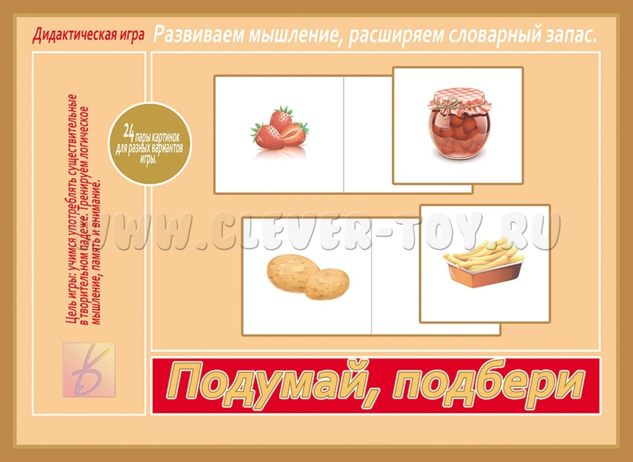 1. Научиться выстраивать логические и ассоциативные связи. В процессе игры дети будут активно работать с карточками двух типов: "предмет" и "то, из чего предмет сделан". Они будут тренировать свои навыки ассоциативного мышления, учиться связывать предметы с тем, из которых они изготовлены. Это поможет им лучше понимать мир вокруг себя и развивать логику.