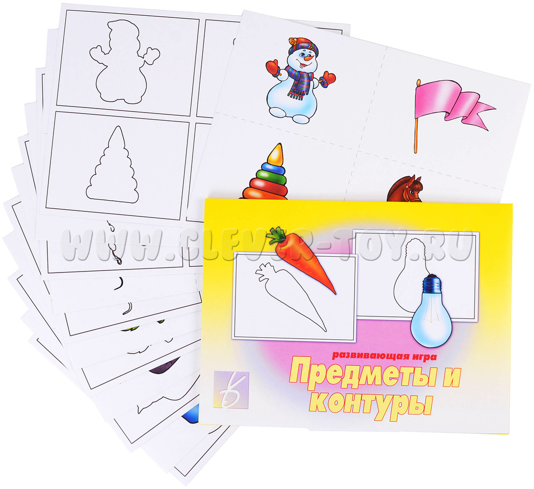 1. Ребенку или группе детей предлагаются большие карты с черными контурами предметов. В случае с группой карты делятся поровну. Ведущий показывает карточку с предметом, ребенок, нашедший подходящий по контуру предмет, забирает её себе;