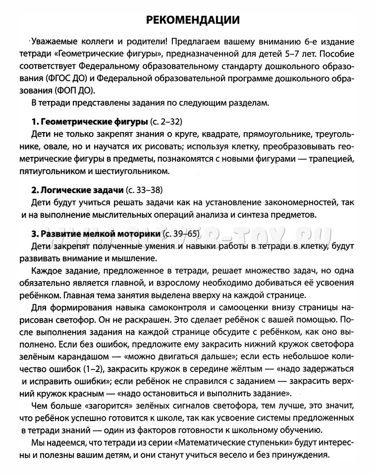 Для формирования навыка самоконтроля и самооценки внизу страницы нарисован светофор. Он не раскрашен. Это сделает ребёнок с вашей помощью. После выполнения задания на каждой странице обсудите с ребёнком, как оно выполнено. Если без ошибок, предложите ему закрасить нижний кружок светофора зелёным карандашом - "можно двигаться дальше"; если есть небольшое количество ошибок (1-2), закрасить кружок в середине жёлтым - «надо задержаться и исправить ошибки»; если ребёнок не справился с заданием - закрасить верхний кружок красным - "надо остановиться и выполнить задание". Чем больше "загорится" зелёных сигналов светофора, тем лучше, это значит, что ребёнок успешно готовится к школе, так как усвоение системы предложенных в тетради знаний - один из факторов готовности к школьному обучению.