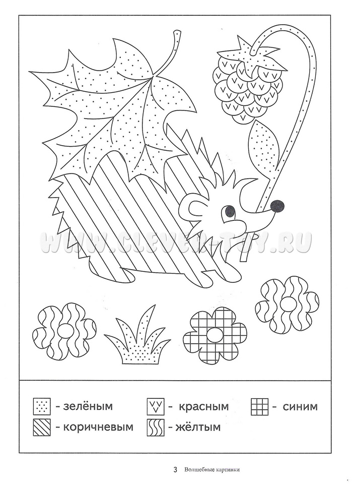 • каждая деталь картинки будет обозначена символом, необходимо найти в условных обозначениях, какой цвет соответствует данному символу, и раскрасить или заштриховать;