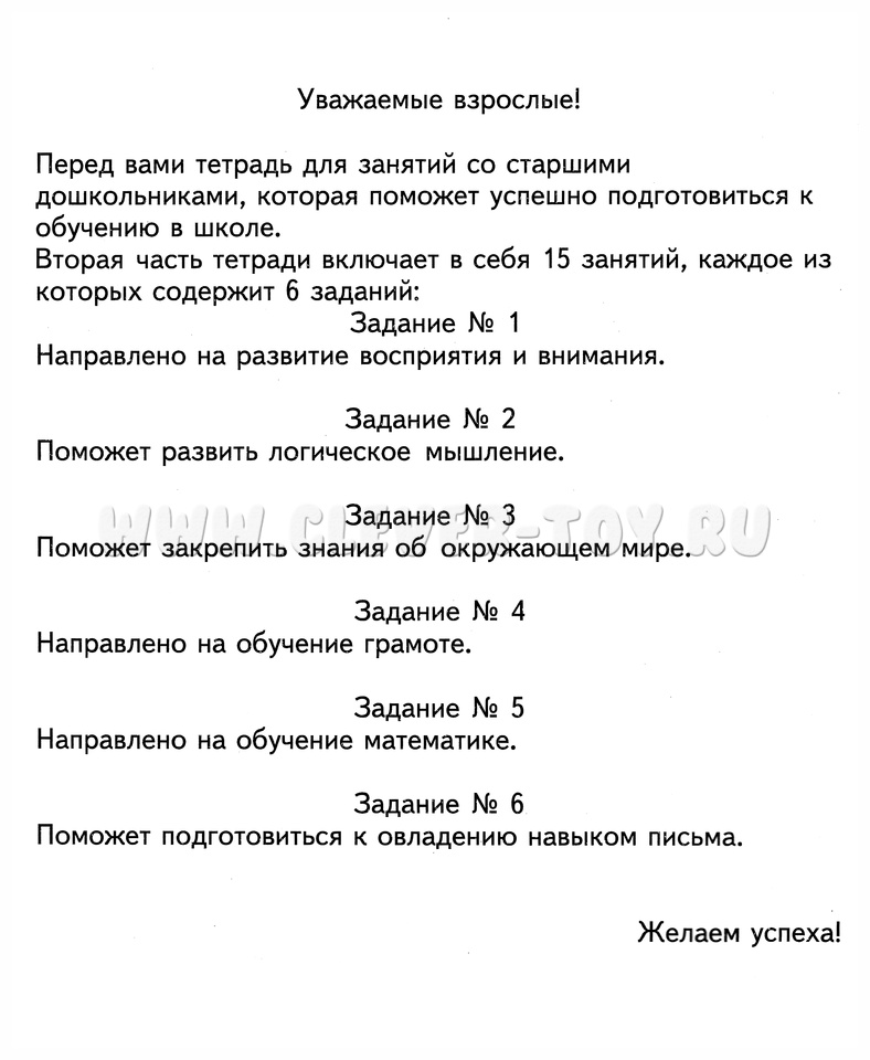 Вторая часть из набора для успешной подготовки к школе старших дошкольников 5-6 лет. Тетрадь подразделена на 15 занятий, каждое из которых состоит из 6 заданий.