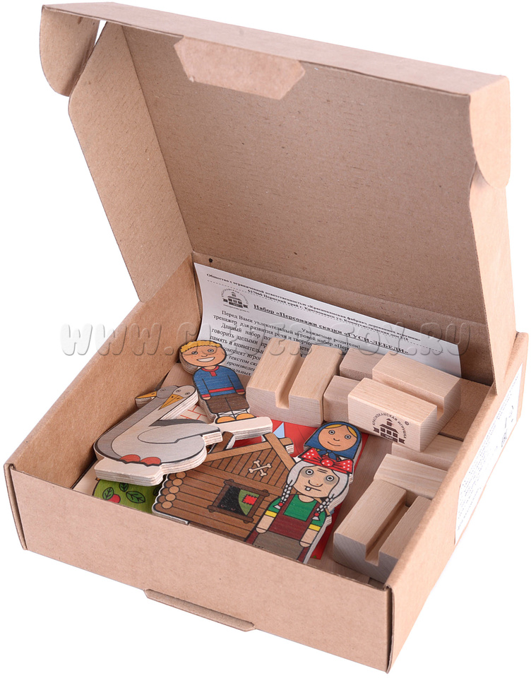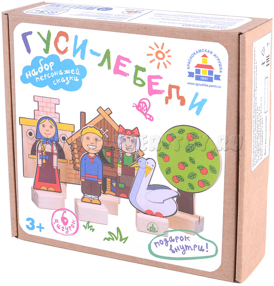 • 6 деревянных фигурок сказочных персонажей и волшебных «декораций»: печка, яблоня, Гуси-Лебеди, Иванушка, Алёнушка, Баба-Яга и домик на курьих ножках;